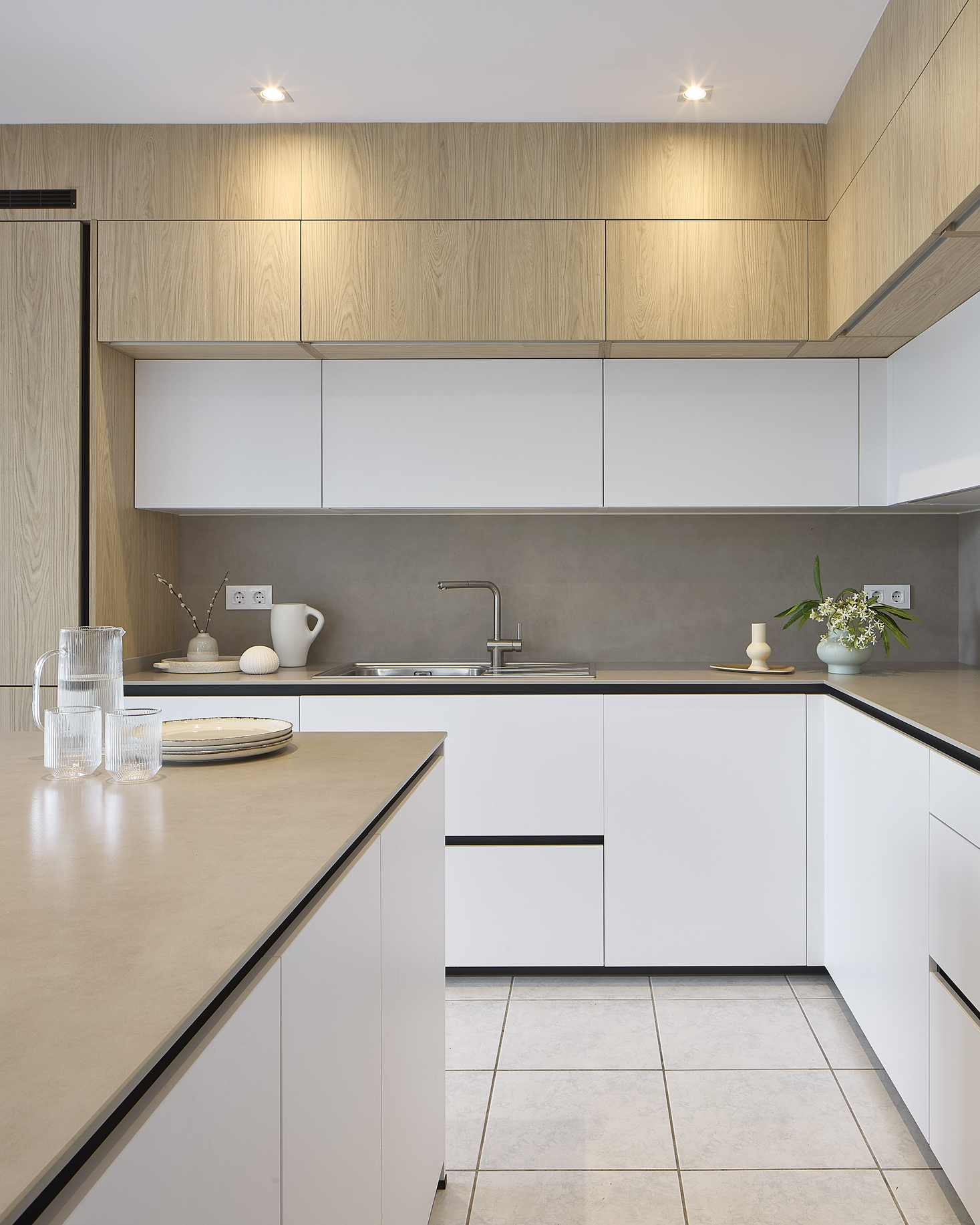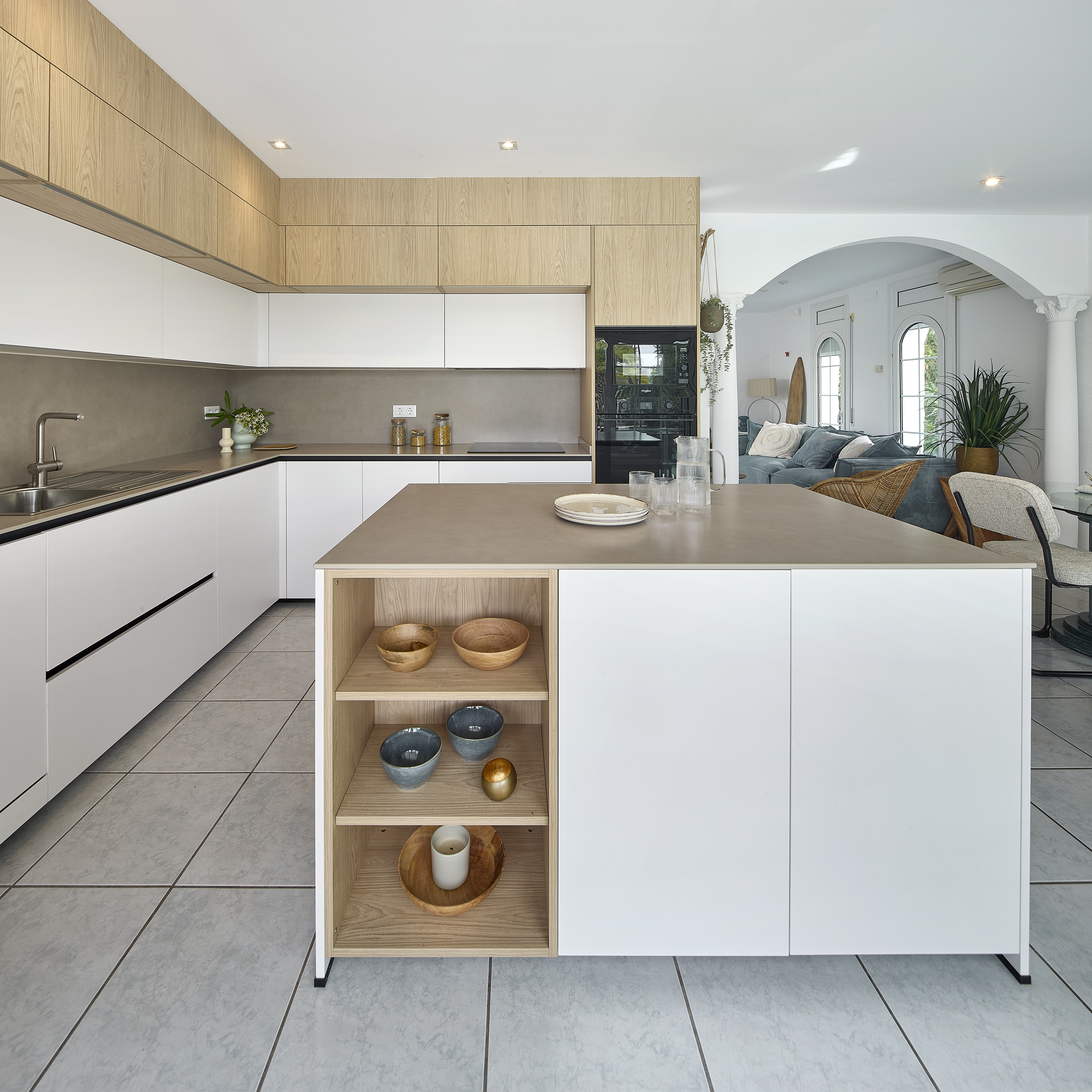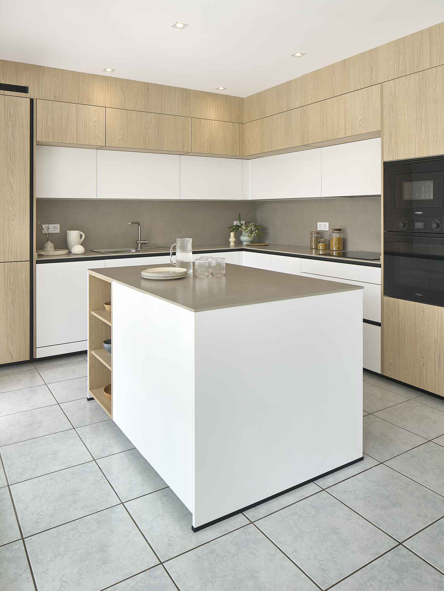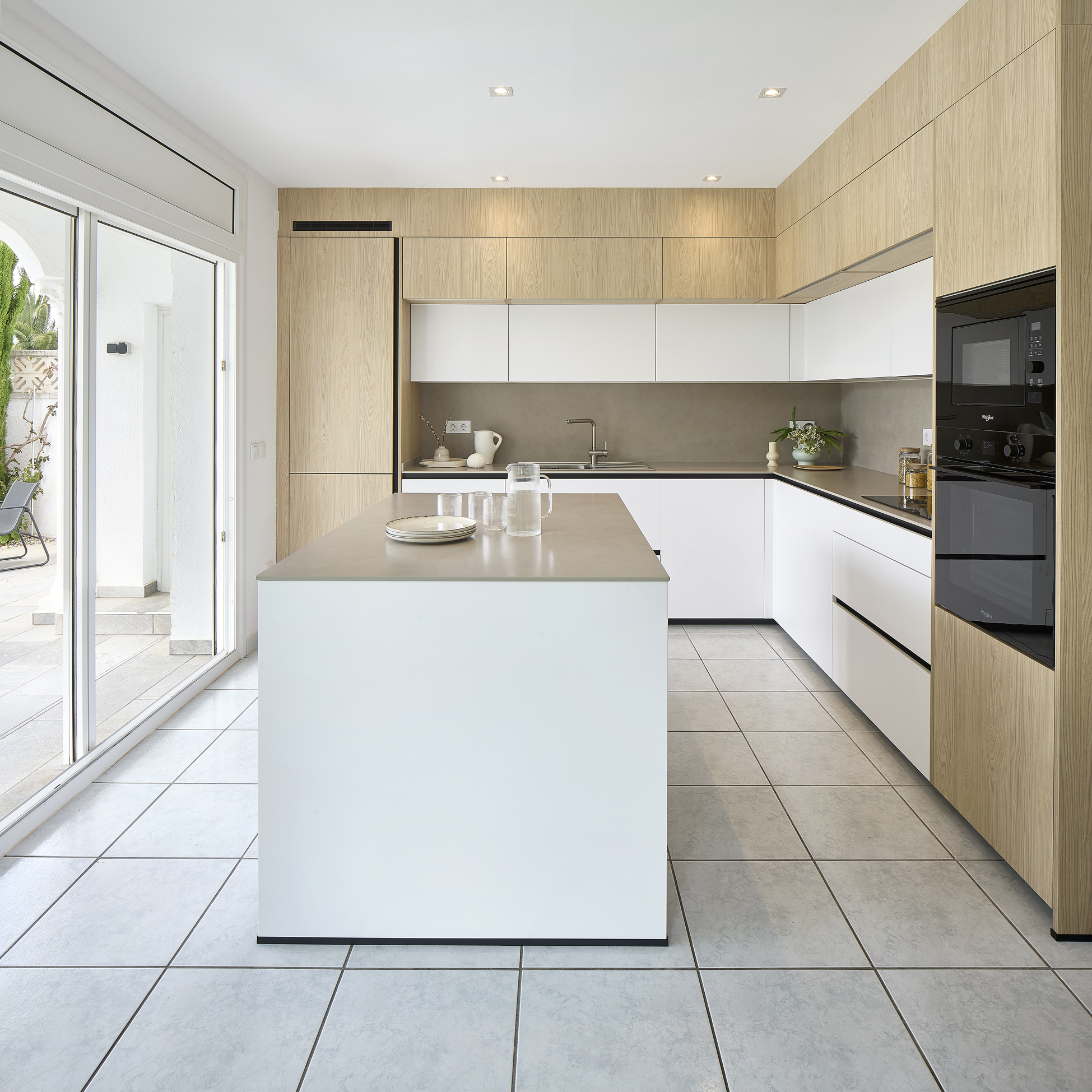 Els mobles combinen l’acabat càlid i natural del roble claro sincro amb la puresa del blanc Innsbruck, generant un contrast equilibrat i molt actual. El taulell i l’illa central estan revestits amb Neolith Pietra di Luna, un material de gran resistència i bellesa atemporal que garanteix durabilitat i fàcil manteniment.