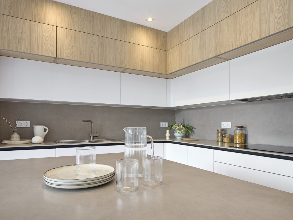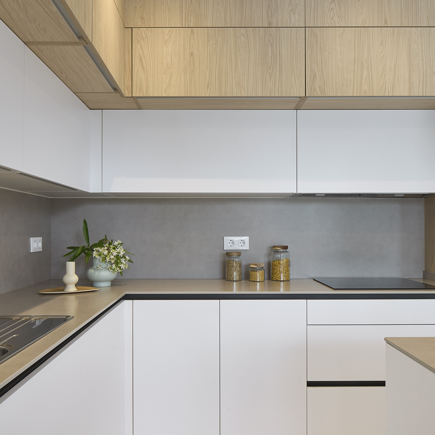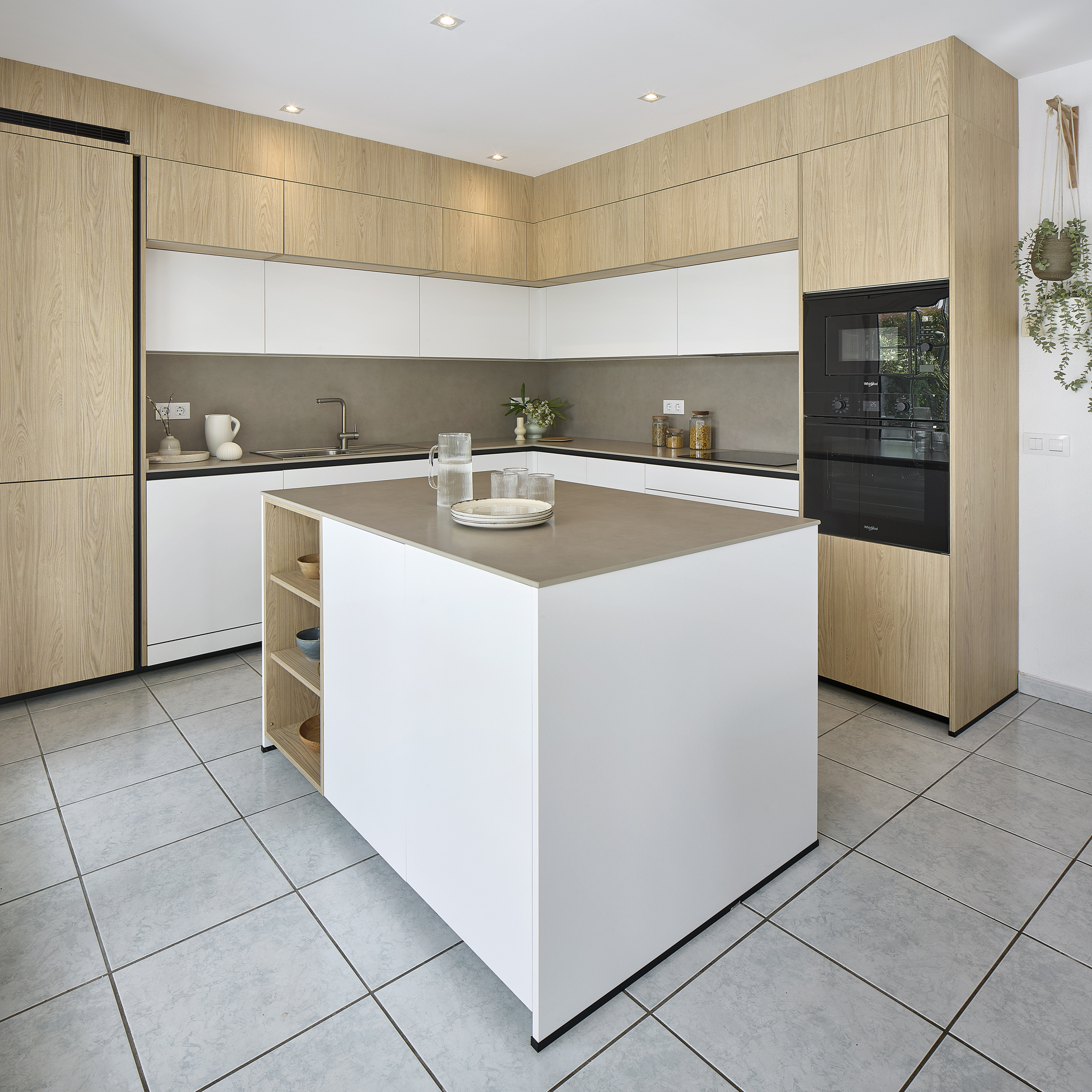 Els mobles combinen l’acabat càlid i natural del roble claro sincro amb la puresa del blanc Innsbruck, generant un contrast equilibrat i molt actual. El taulell i l’illa central estan revestits amb Neolith Pietra di Luna, un material de gran resistència i bellesa atemporal que garanteix durabilitat i fàcil manteniment.