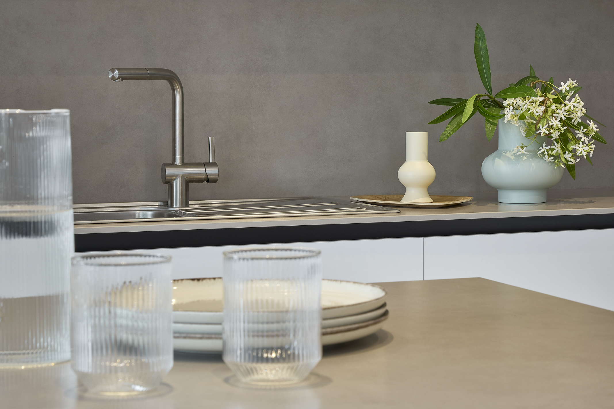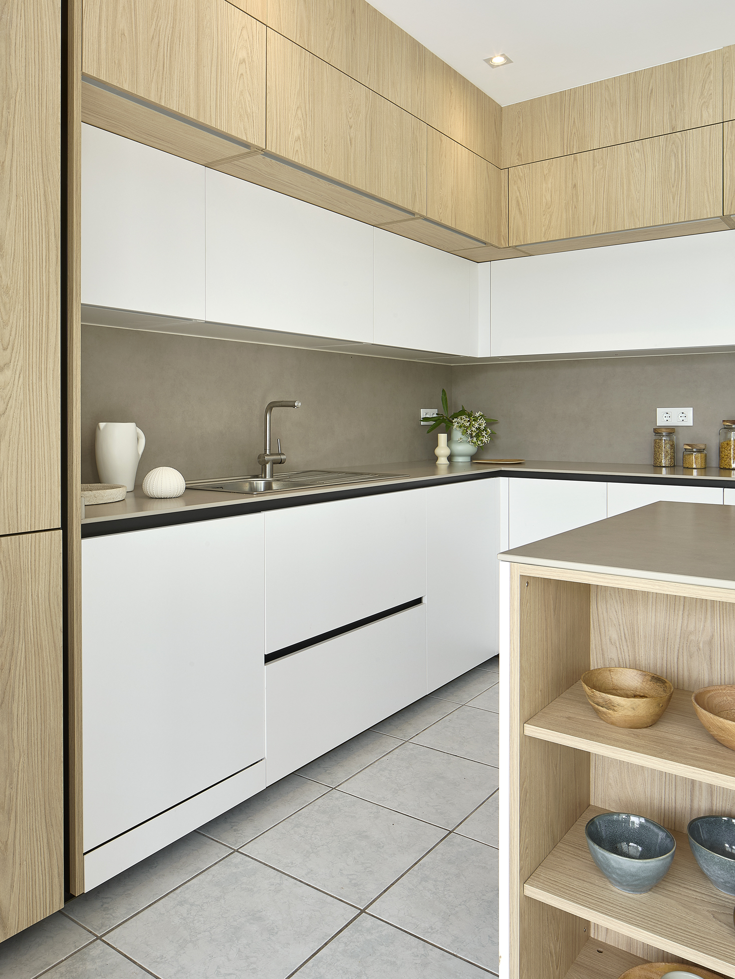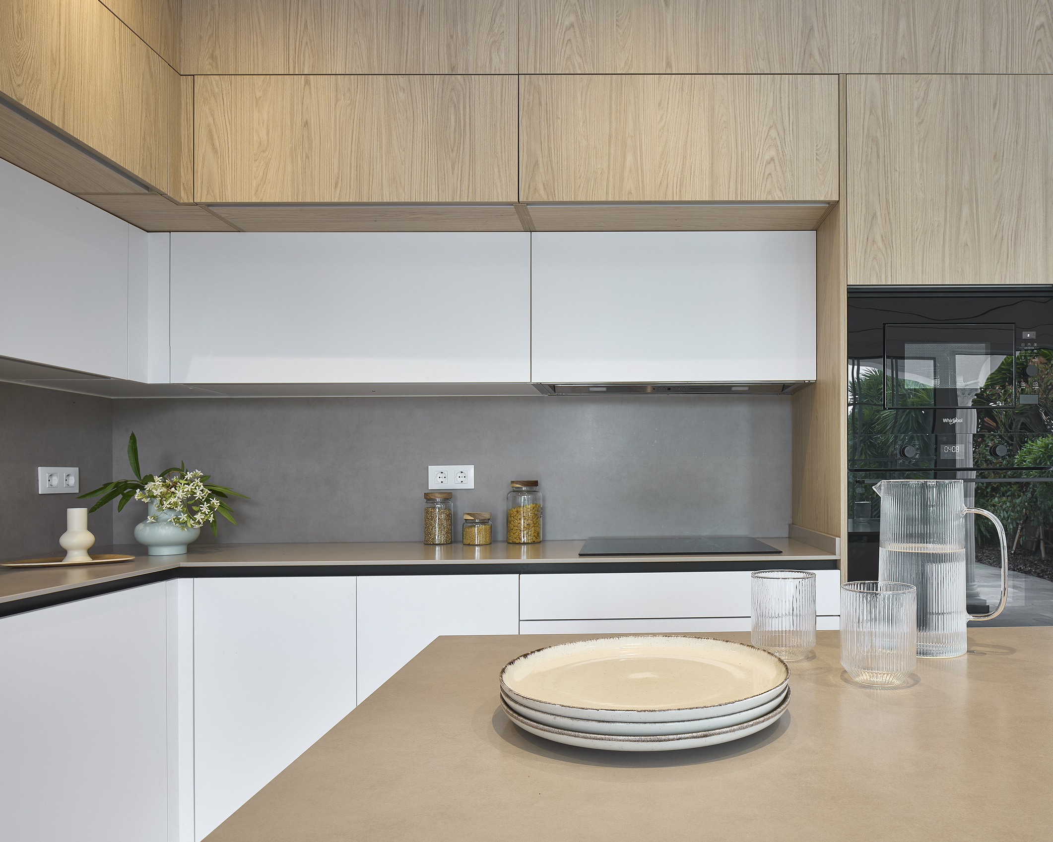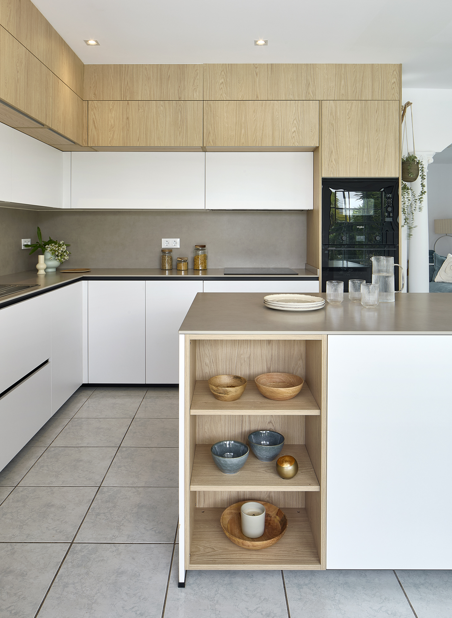 Els mobles combinen l’acabat càlid i natural del roble claro sincro amb la puresa del blanc Innsbruck, generant un contrast equilibrat i molt actual. El taulell i l’illa central estan revestits amb Neolith Pietra di Luna, un material de gran resistència i bellesa atemporal que garanteix durabilitat i fàcil manteniment.