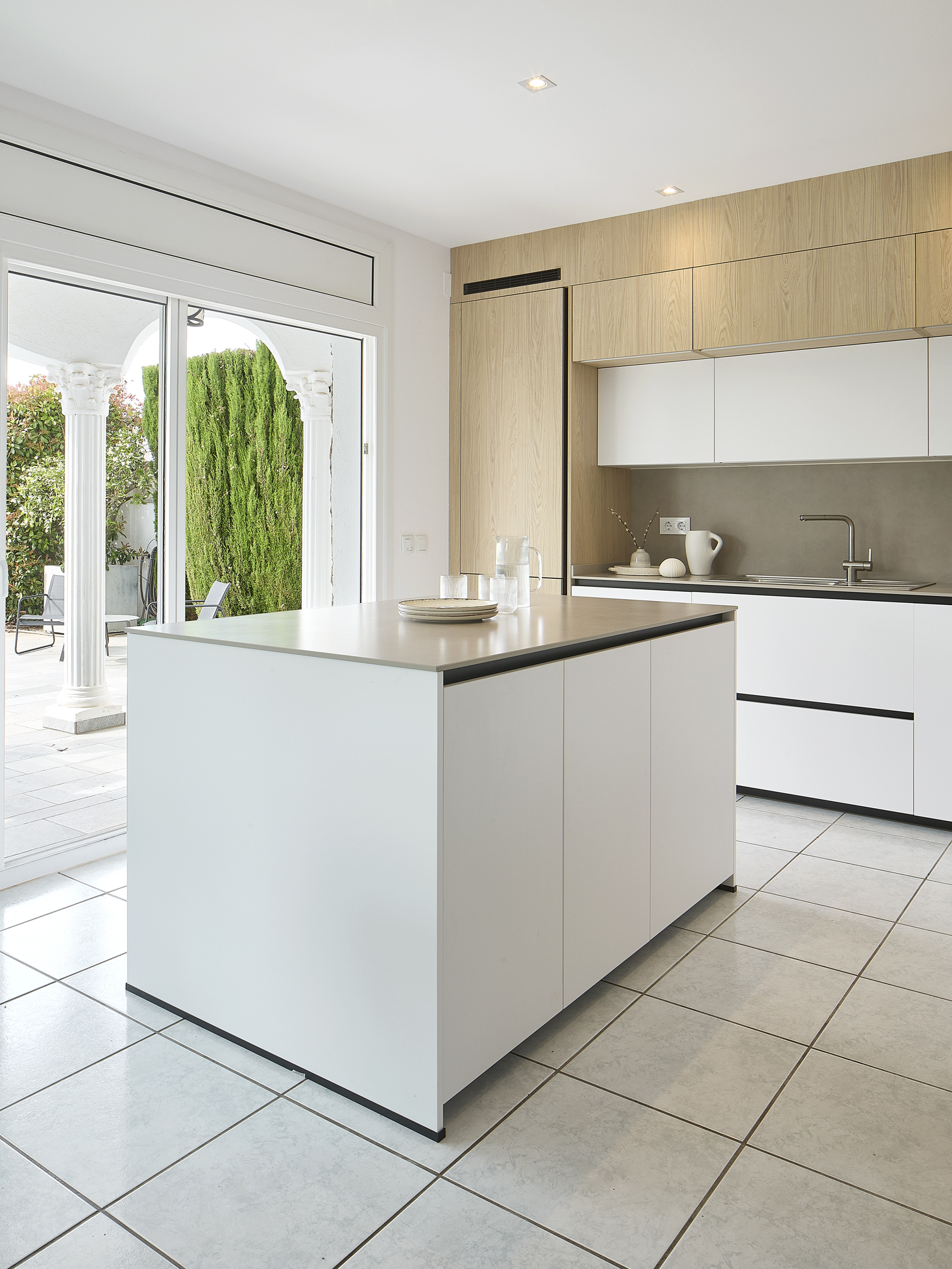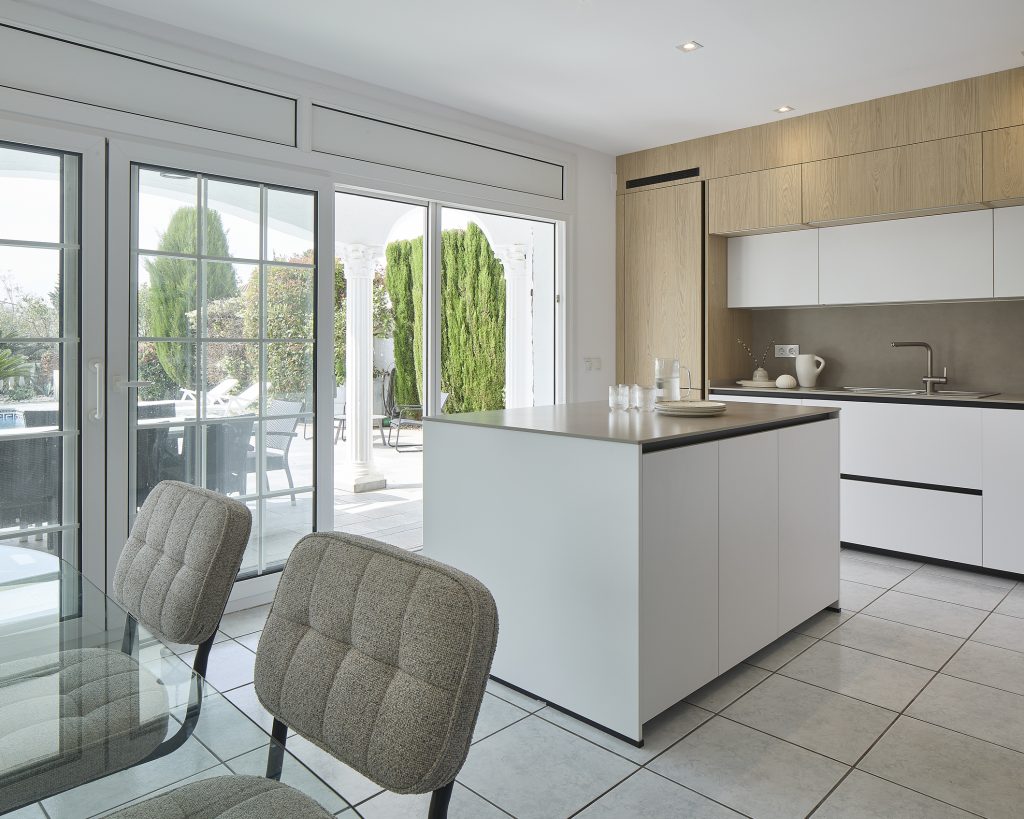 L’illa central actua com a eix central de l’espai, ideal per a preparar, cuinar i compartir moments. La cuina es connecta visualment amb l’exterior gràcies a grans obertures que inunden l’estança de llum natural.