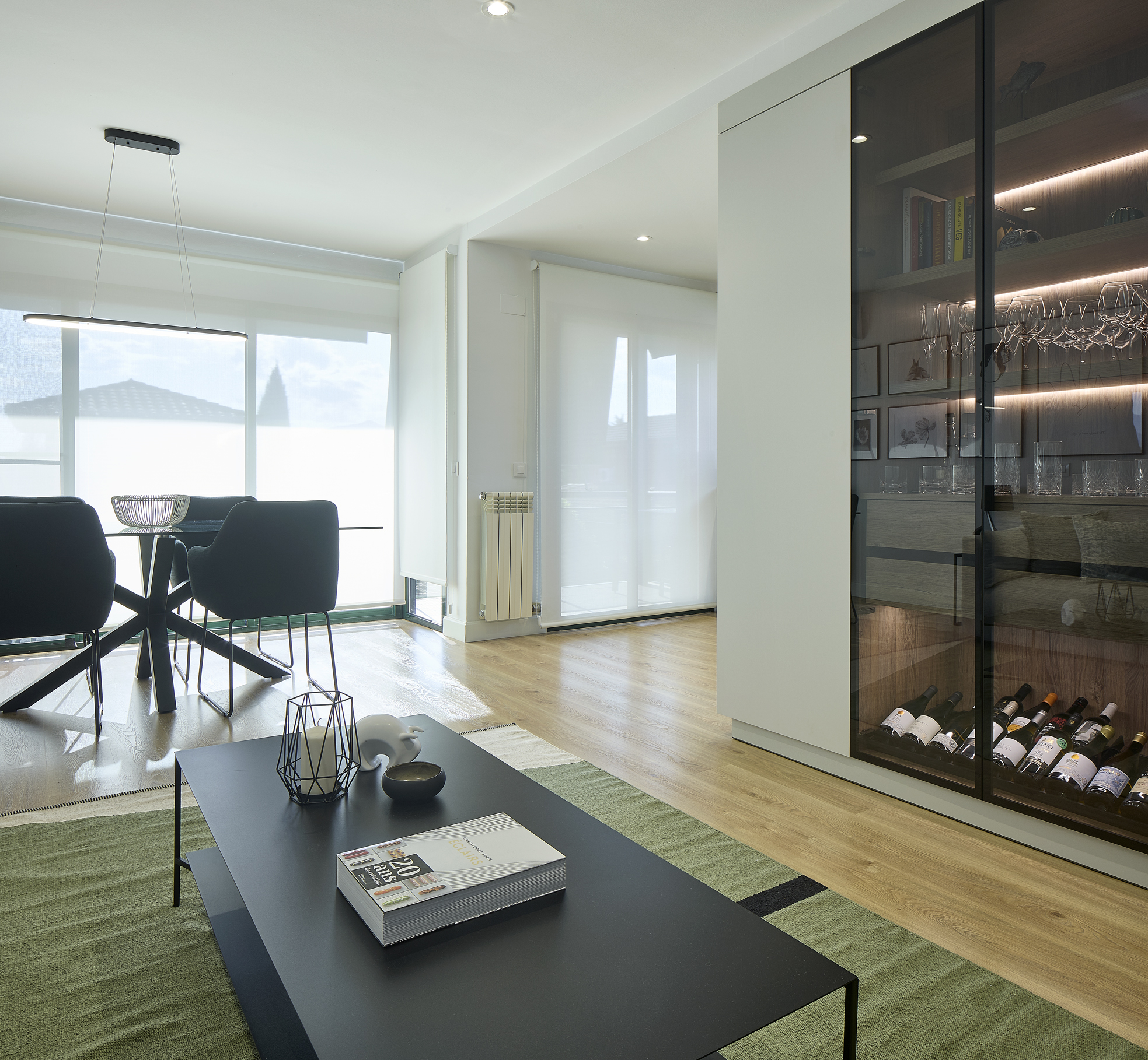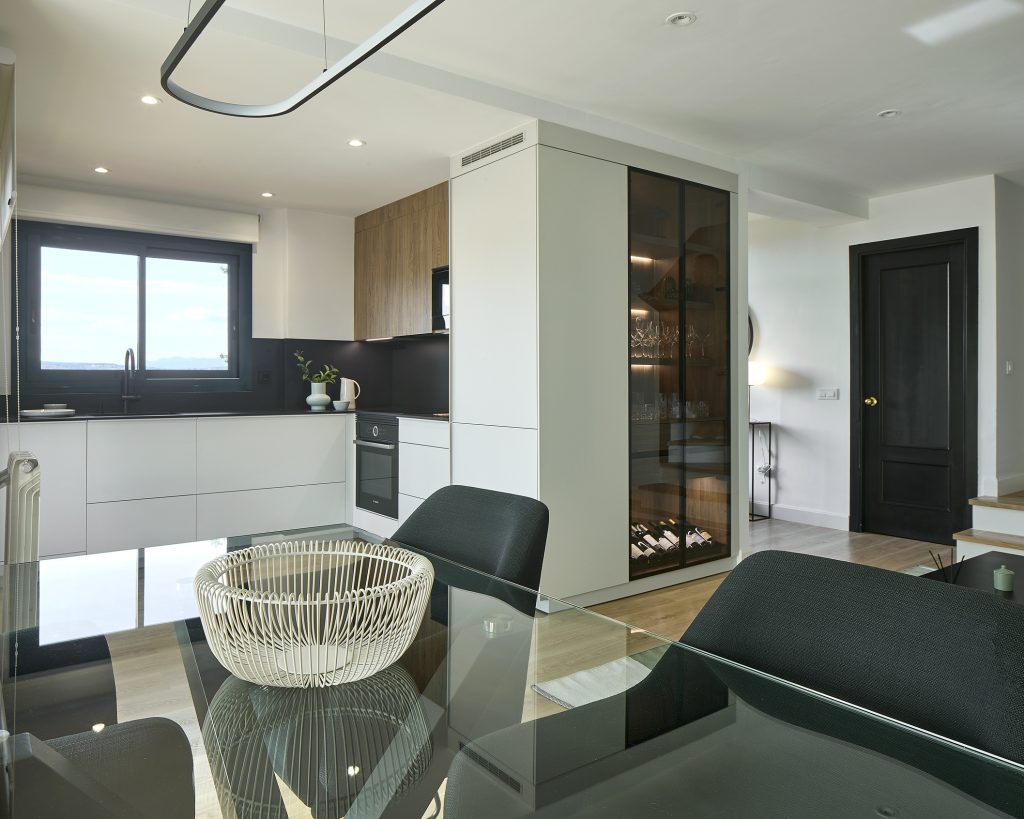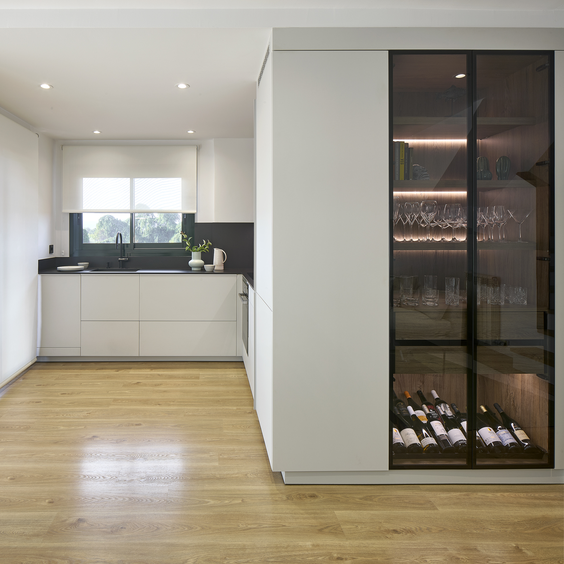 La vitrina és un dels elements més característics i elegants d’aquesta cuina. Es tracta d’una vitrina de dues portes amb vidre fumat, que aporta privacitat visual i alhora permet entreveure l’interior amb un efecte sofisticat. El seu disseny integrat s’adapta perfectament a la línia del mobiliari general, i actua com una transició visual entre la cuina i el menjador.