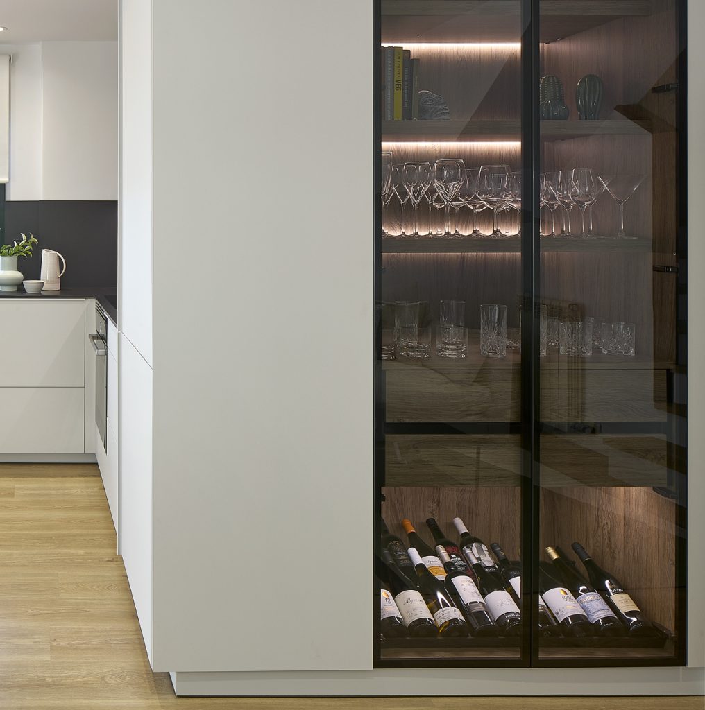 A més, compta amb un accessori específic per a ampolles de vi a la part inferior, que permet mantenir-les ordenades i ben visibles, ideal per als amants de l’enologia. L’il·luminació interior LED realça tant el contingut com el mateix disseny de la vitrina, aportant calidesa i sofisticació a l’ambient general de la cuina.