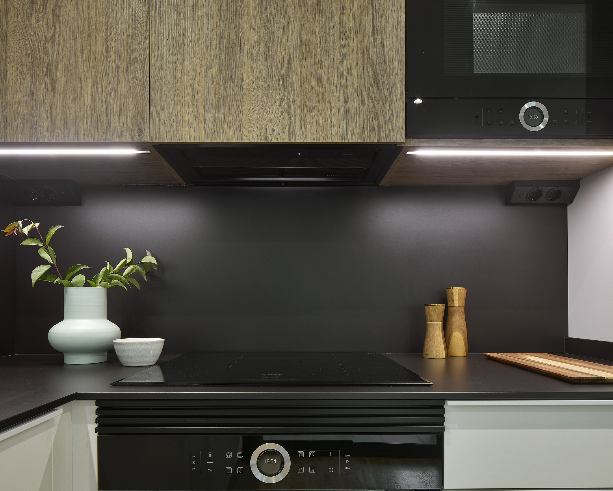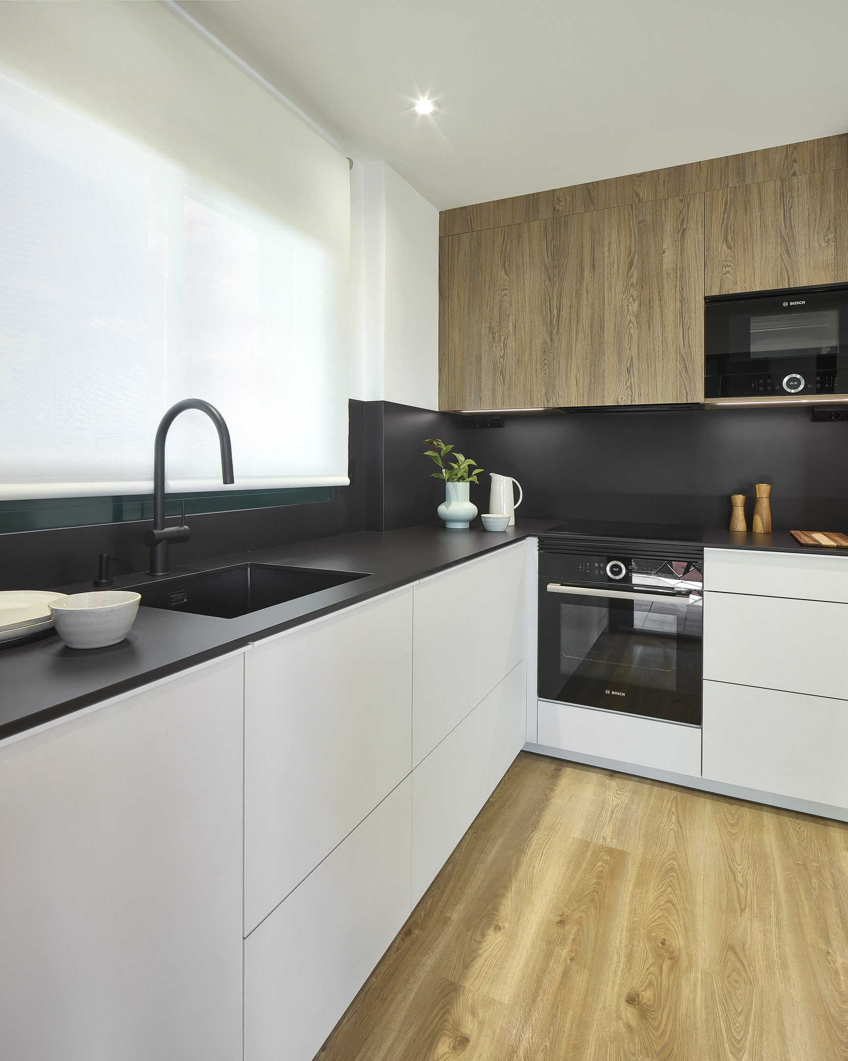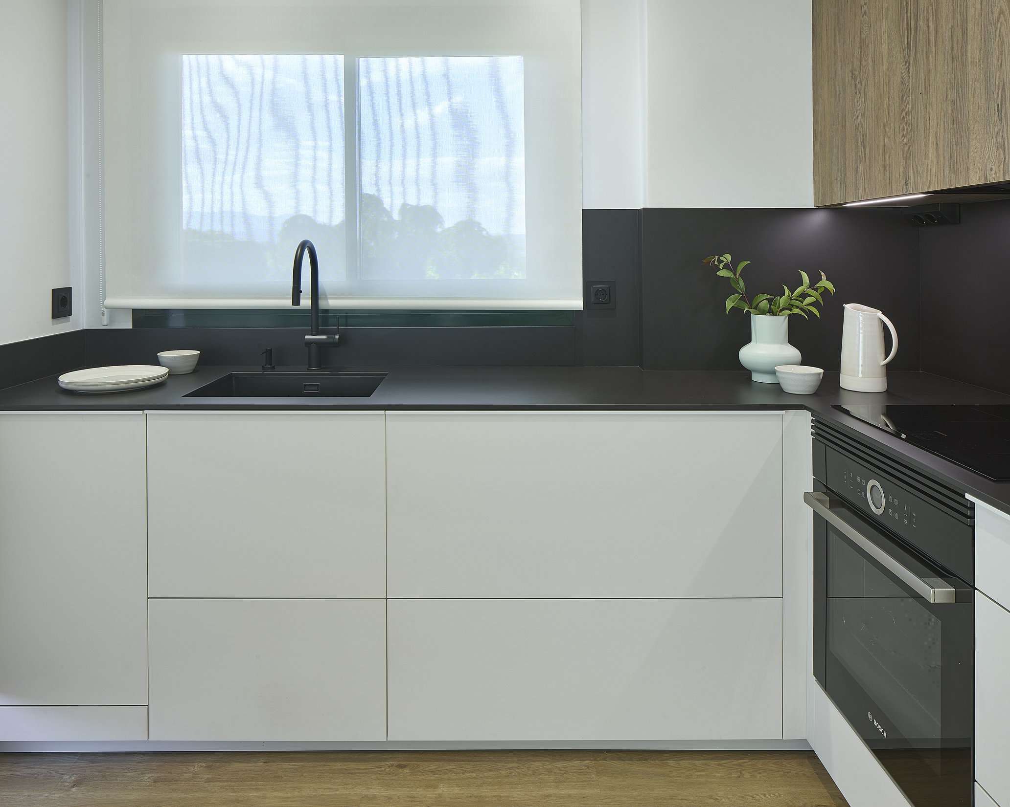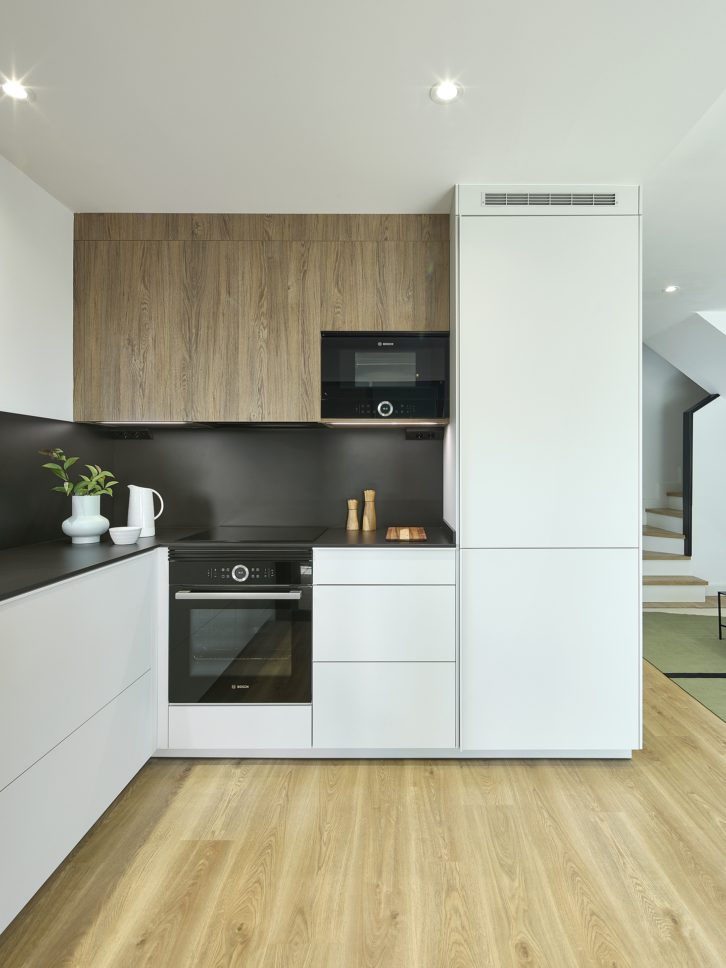 Aquesta cuina destaca per un disseny modern i minimalista amb una combinació molt elegant de materials i colors. Els mobles alts estan acabats en roble kairós, mentre que els baixos i les columnes són amb acabat gris bruma, creant un contrast càlid i sofisticat. L’encimera és d’Inalco negre natural, que afegeix un toc contemporani i reforça l’estètica neta i refinada de l’espai.