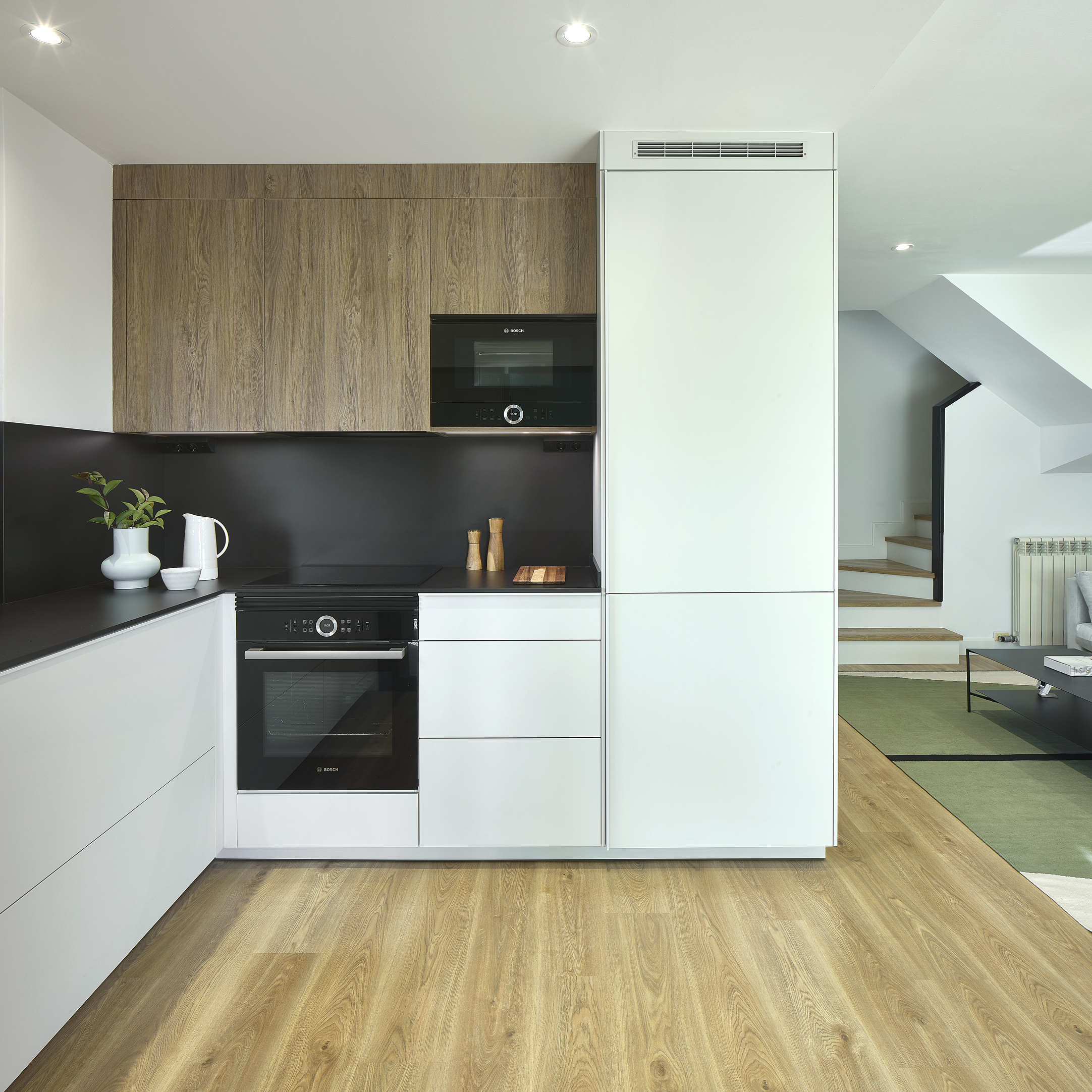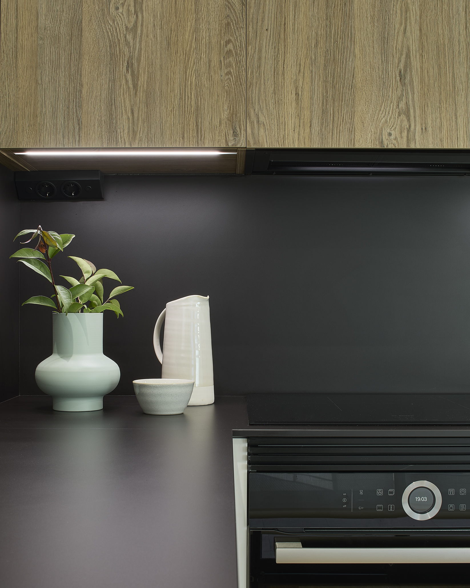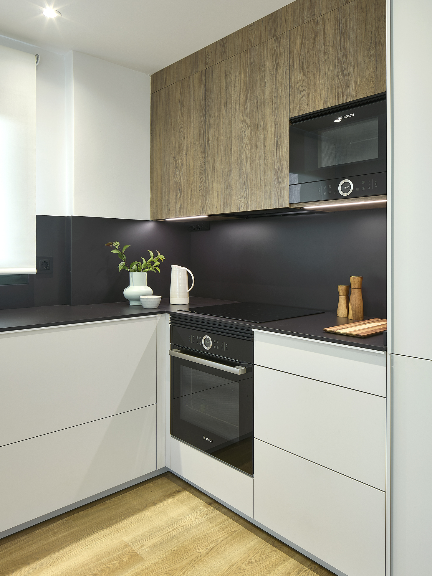 Aquesta cuina destaca per un disseny modern i minimalista amb una combinació molt elegant de materials i colors. Els mobles alts estan acabats en roble kairós, mentre que els baixos i les columnes són amb acabat gris bruma, creant un contrast càlid i sofisticat. L’encimera és d’Inalco negre natural, que afegeix un toc contemporani i reforça l’estètica neta i refinada de l’espai.