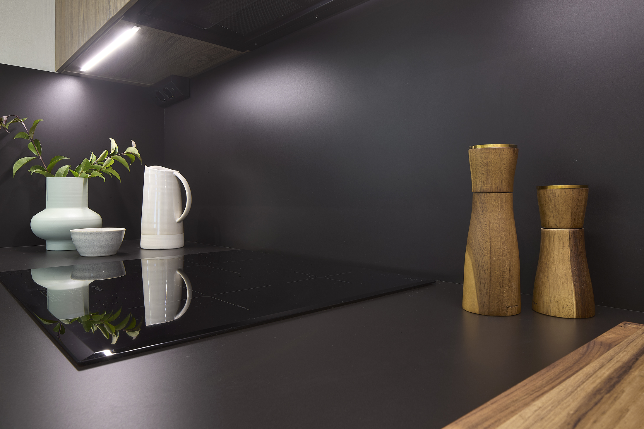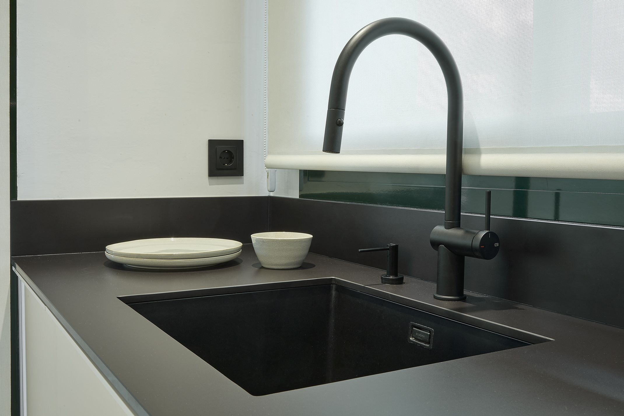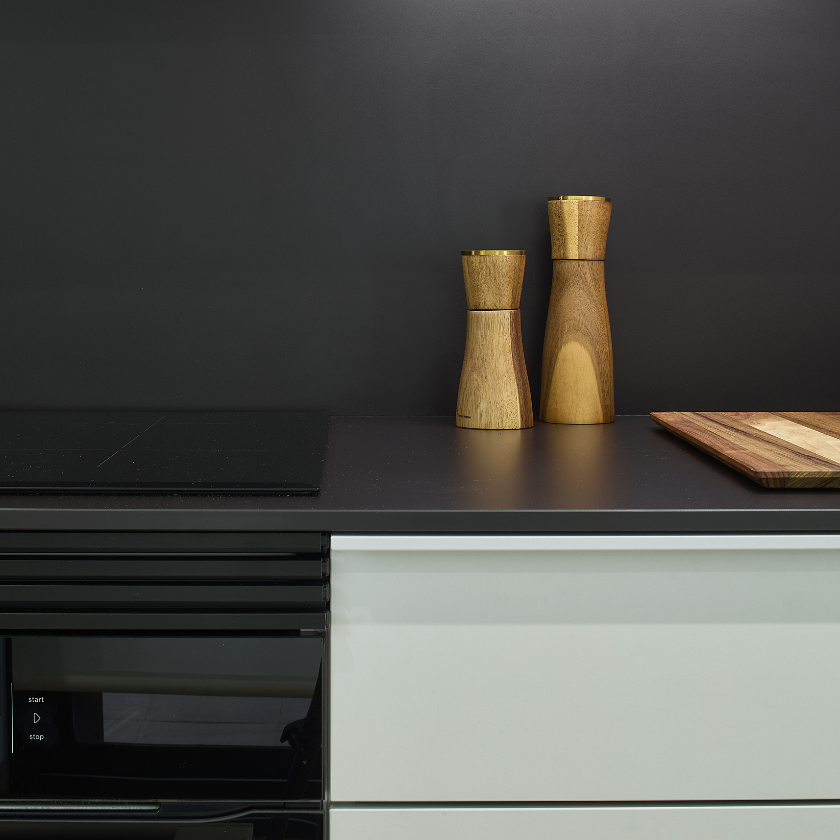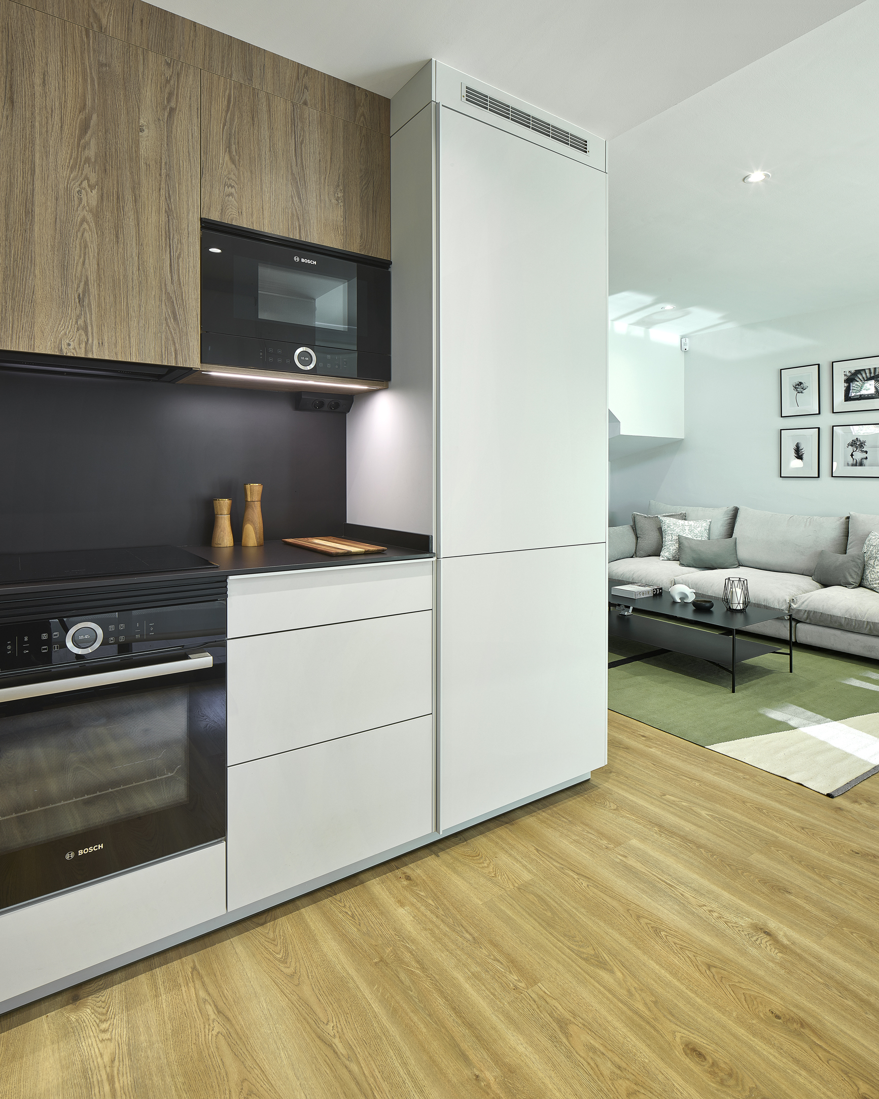 Aquesta cuina destaca per un disseny modern i minimalista amb una combinació molt elegant de materials i colors. Els mobles alts estan acabats en roble kairós, mentre que els baixos i les columnes són amb acabat gris bruma, creant un contrast càlid i sofisticat. L’encimera és d’Inalco negre natural, que afegeix un toc contemporani i reforça l’estètica neta i refinada de l’espai.
