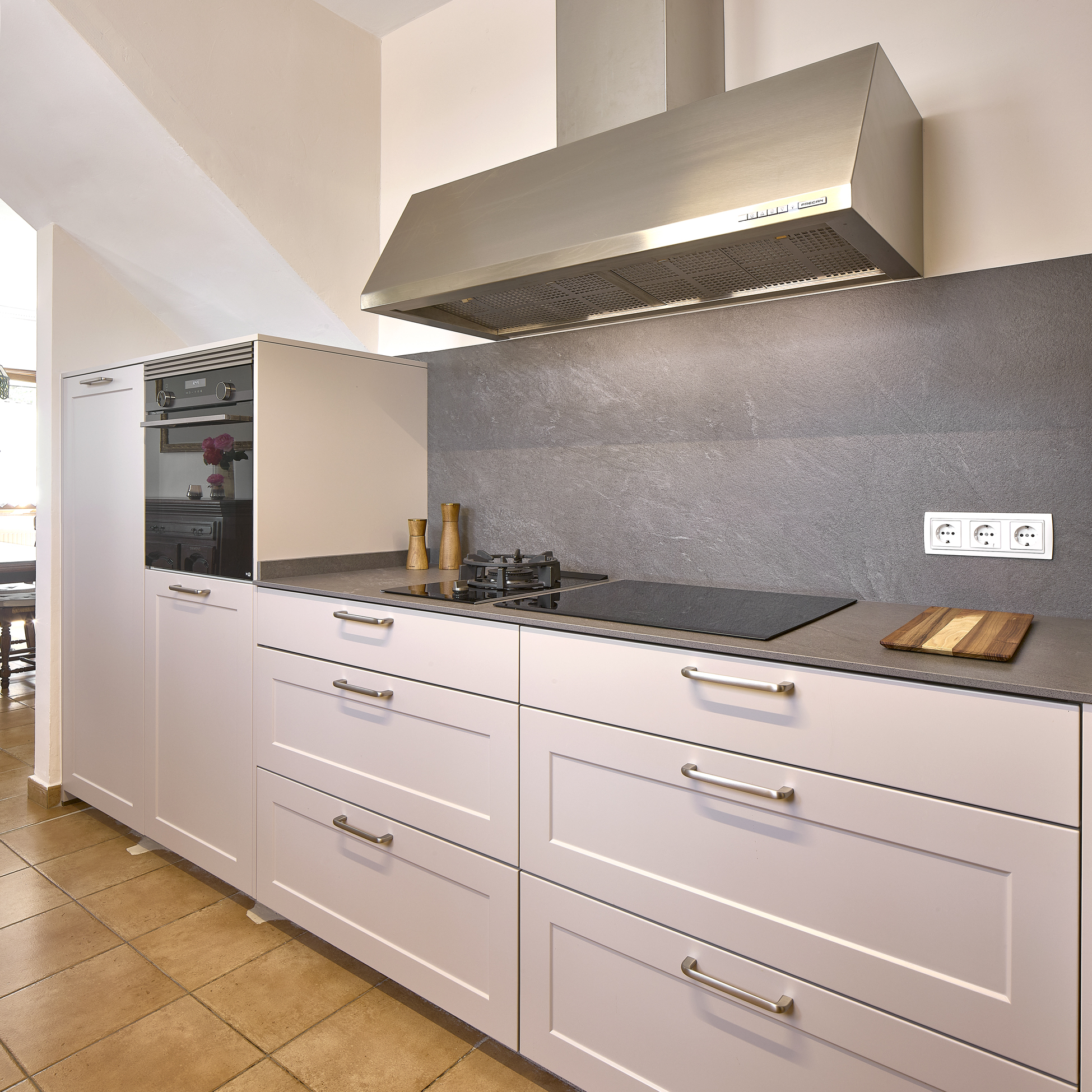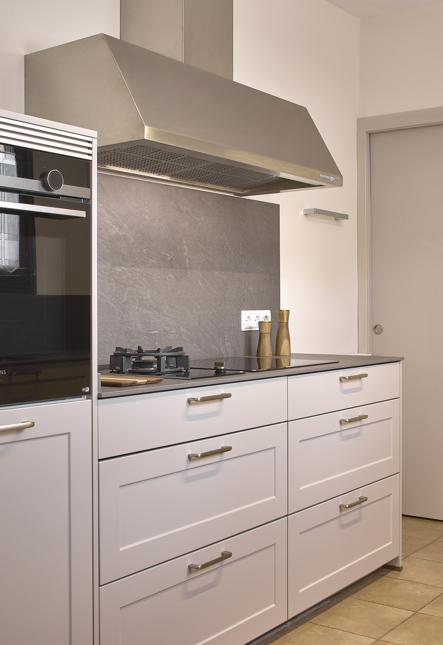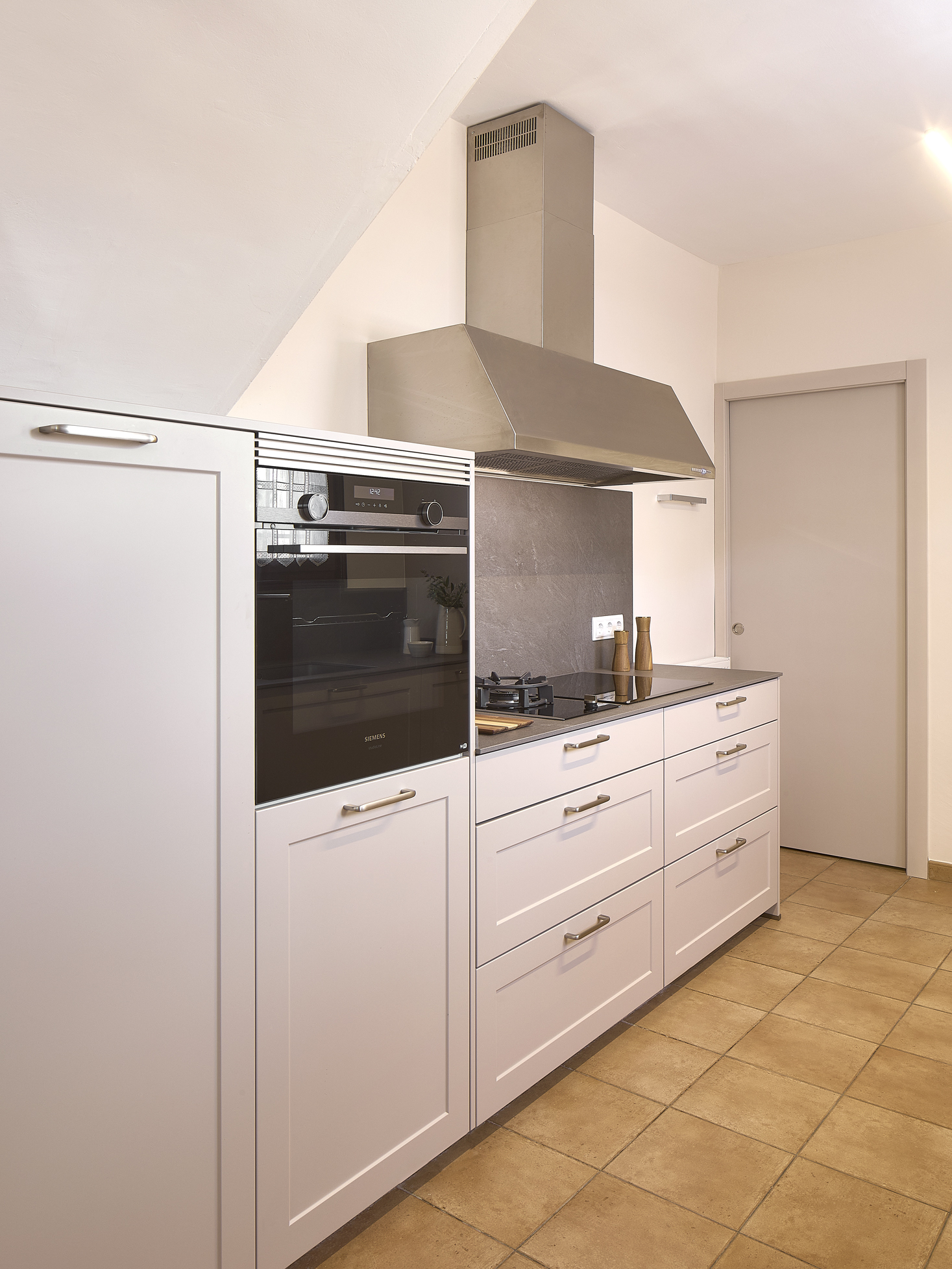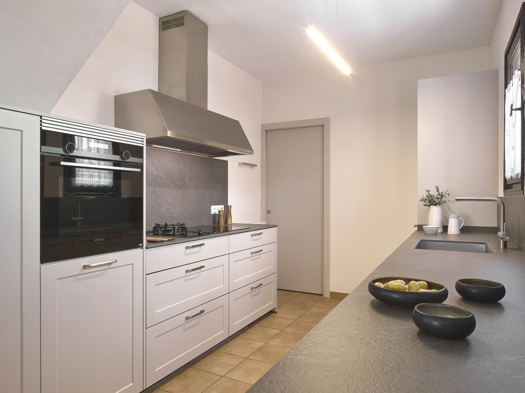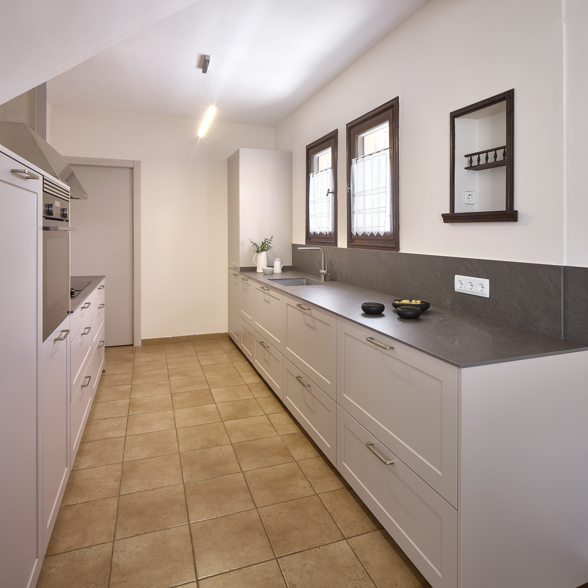 Aquesta cuina realitzada a Castelló d’Empúries és un clar exemple d’equilibri entre l’estètica clàssica i les prestacions modernes. Pertanyent a la sèrie Marco, aquest model destaca pel seu disseny atemporal amb portes emmarcades lacades en color cashmere, un to suau i càlid que aporta lluminositat i sensació de confort a l’espai.