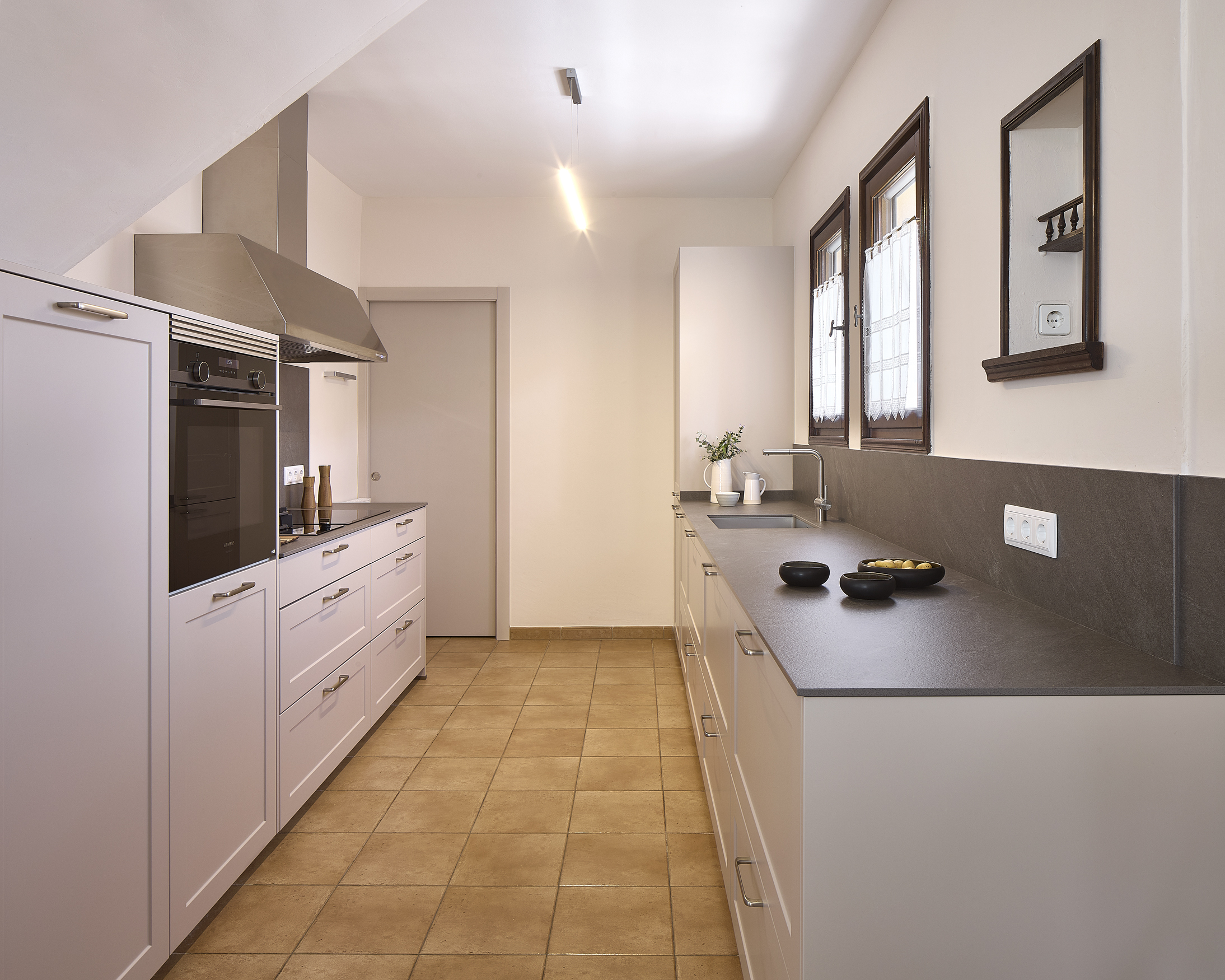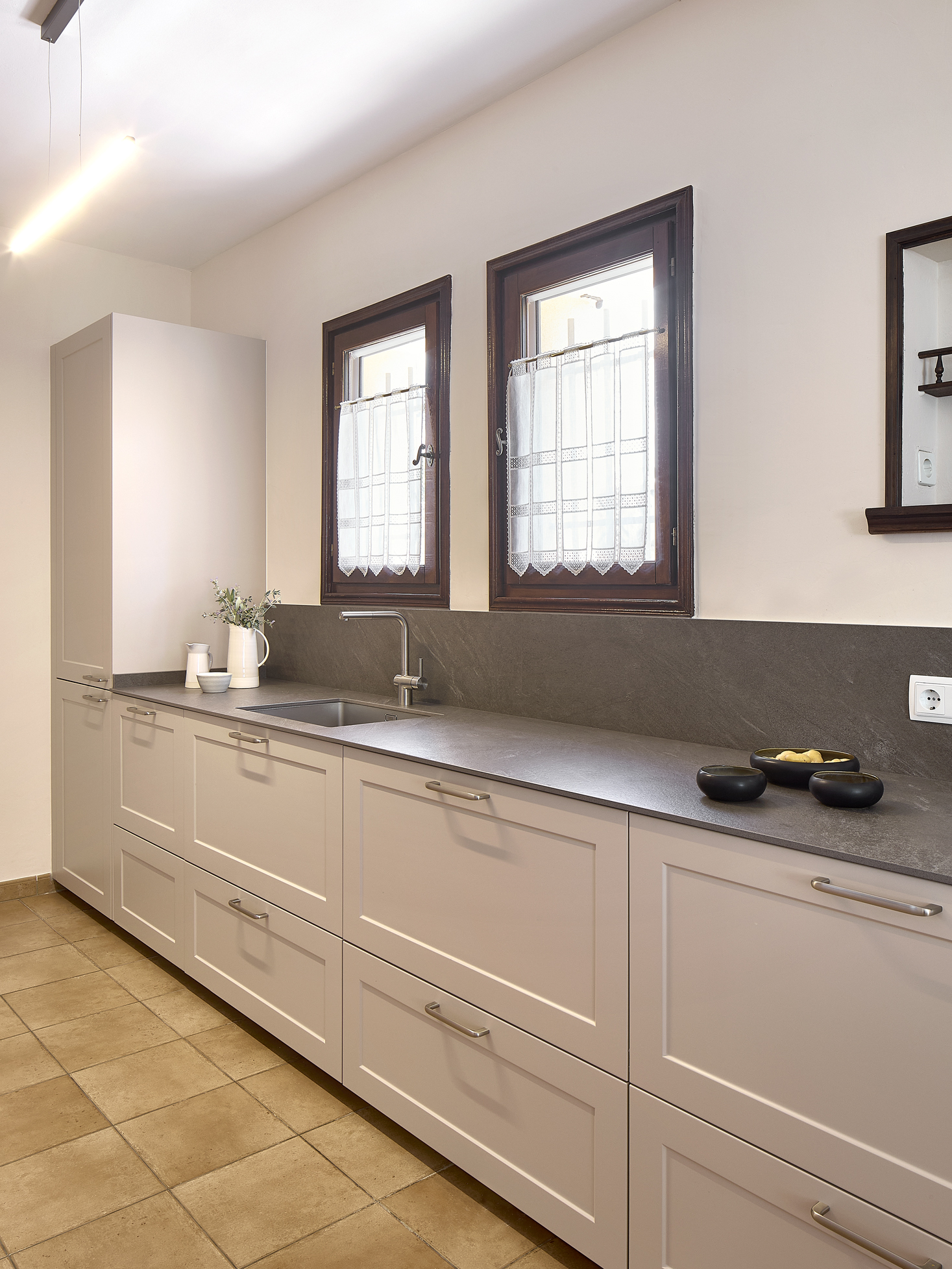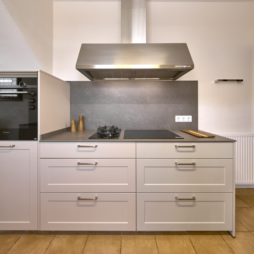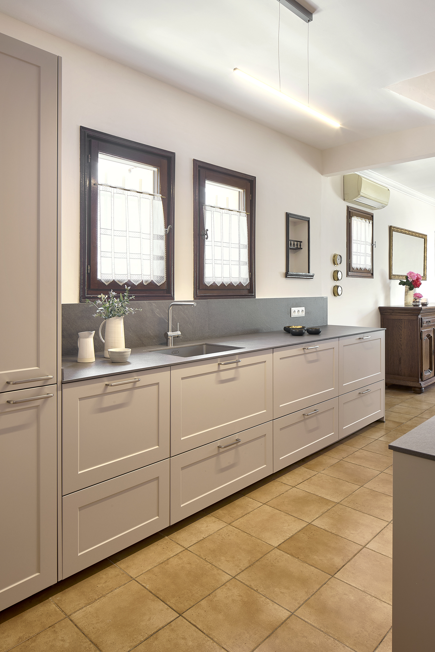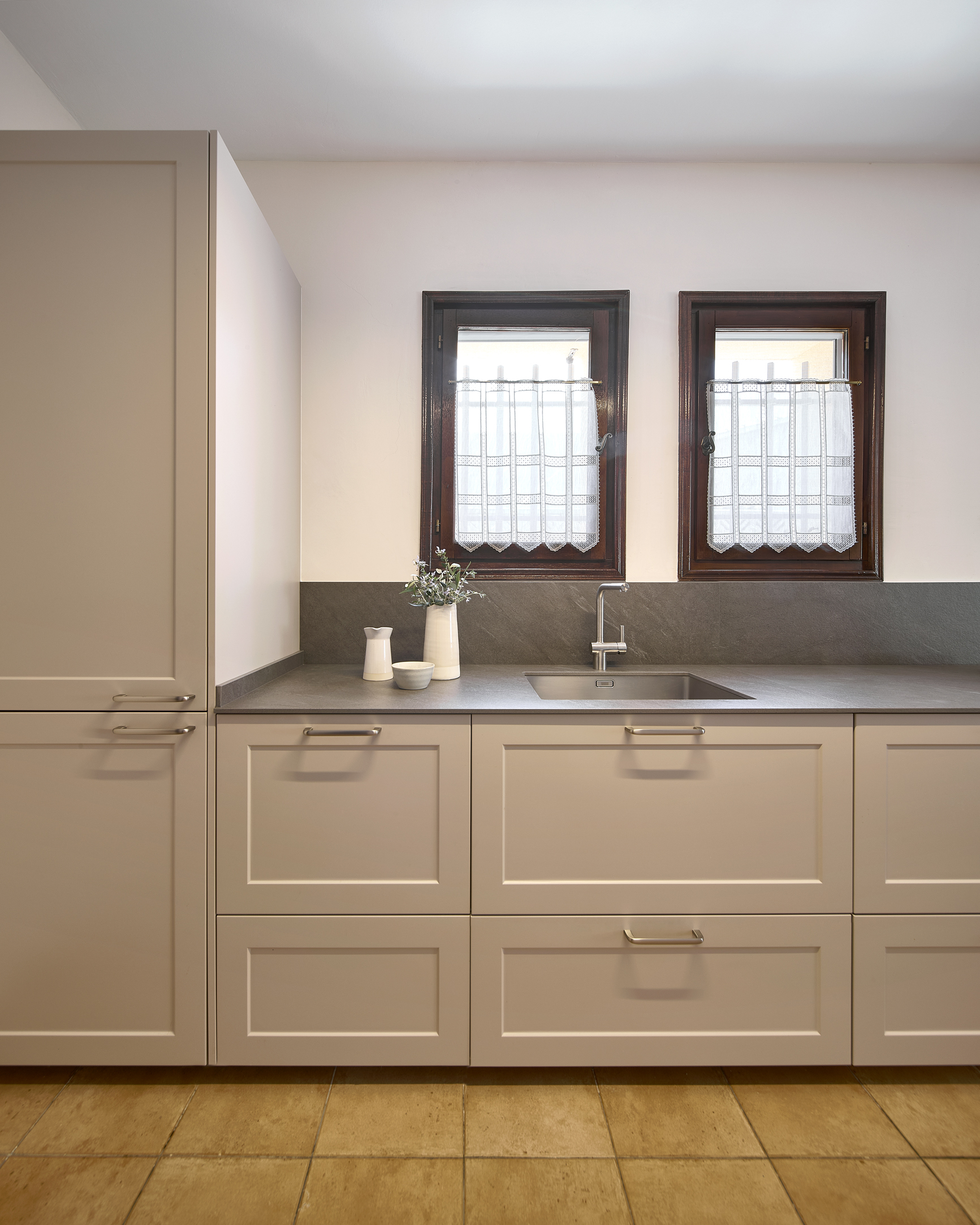 Aquesta cuina realitzada a Castelló d’Empúries és un clar exemple d’equilibri entre l’estètica clàssica i les prestacions modernes. Pertanyent a la sèrie Marco, aquest model destaca pel seu disseny atemporal amb portes emmarcades lacades en color cashmere, un to suau i càlid que aporta lluminositat i sensació de confort a l’espai.