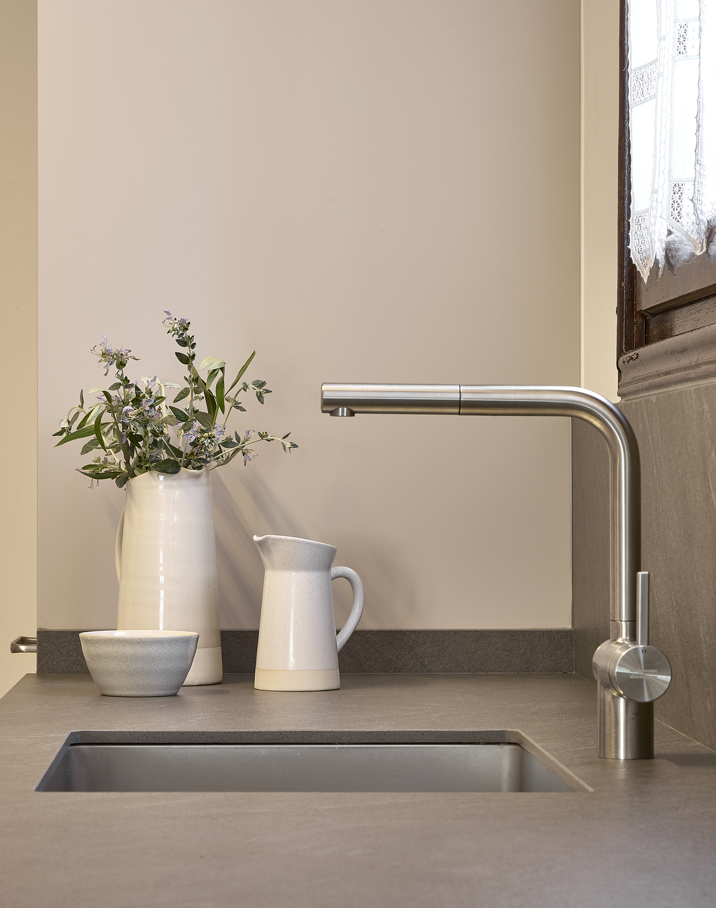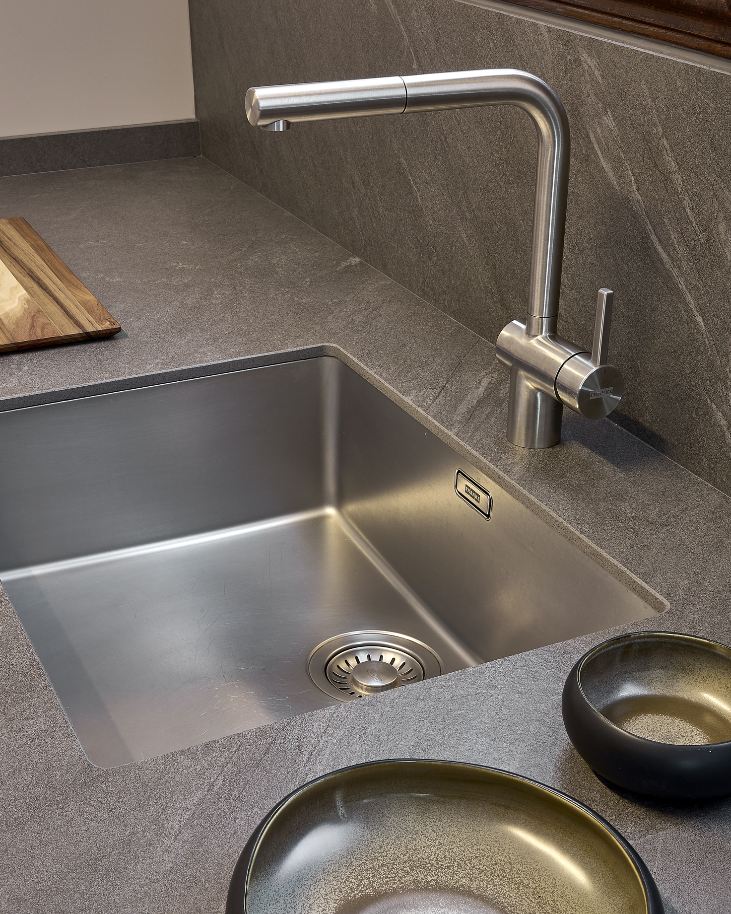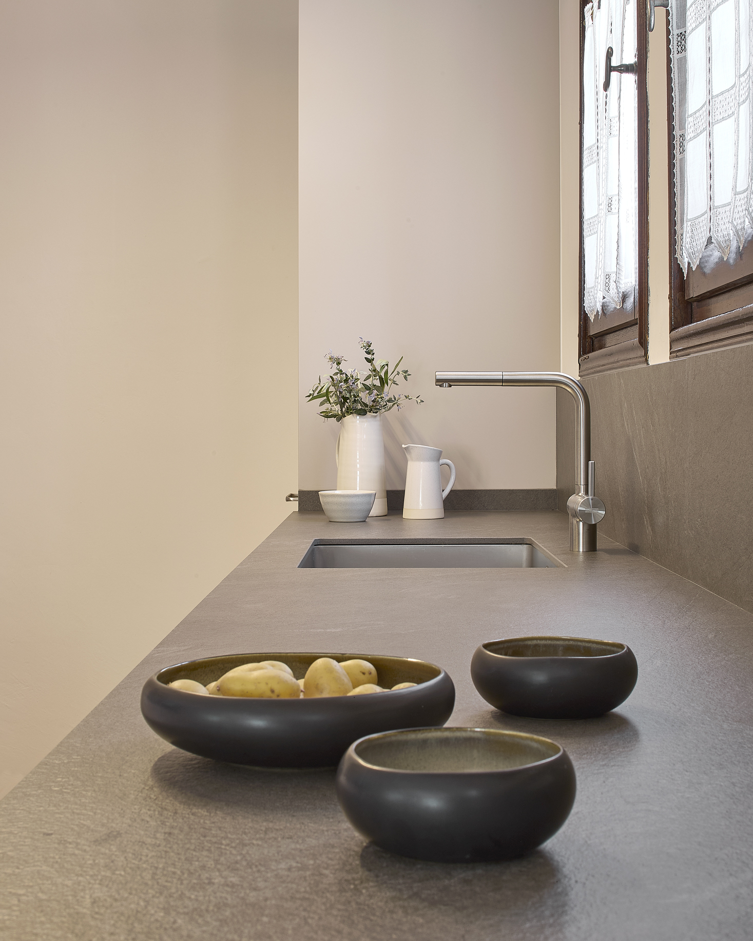L’encimera Inalco en acabat gris abujardado completa el conjunt amb una textura subtilment rugosa i un to elegant que contrasta de manera delicada amb els frontals, oferint una superfície sòlida, resistent i visualment sofisticada.