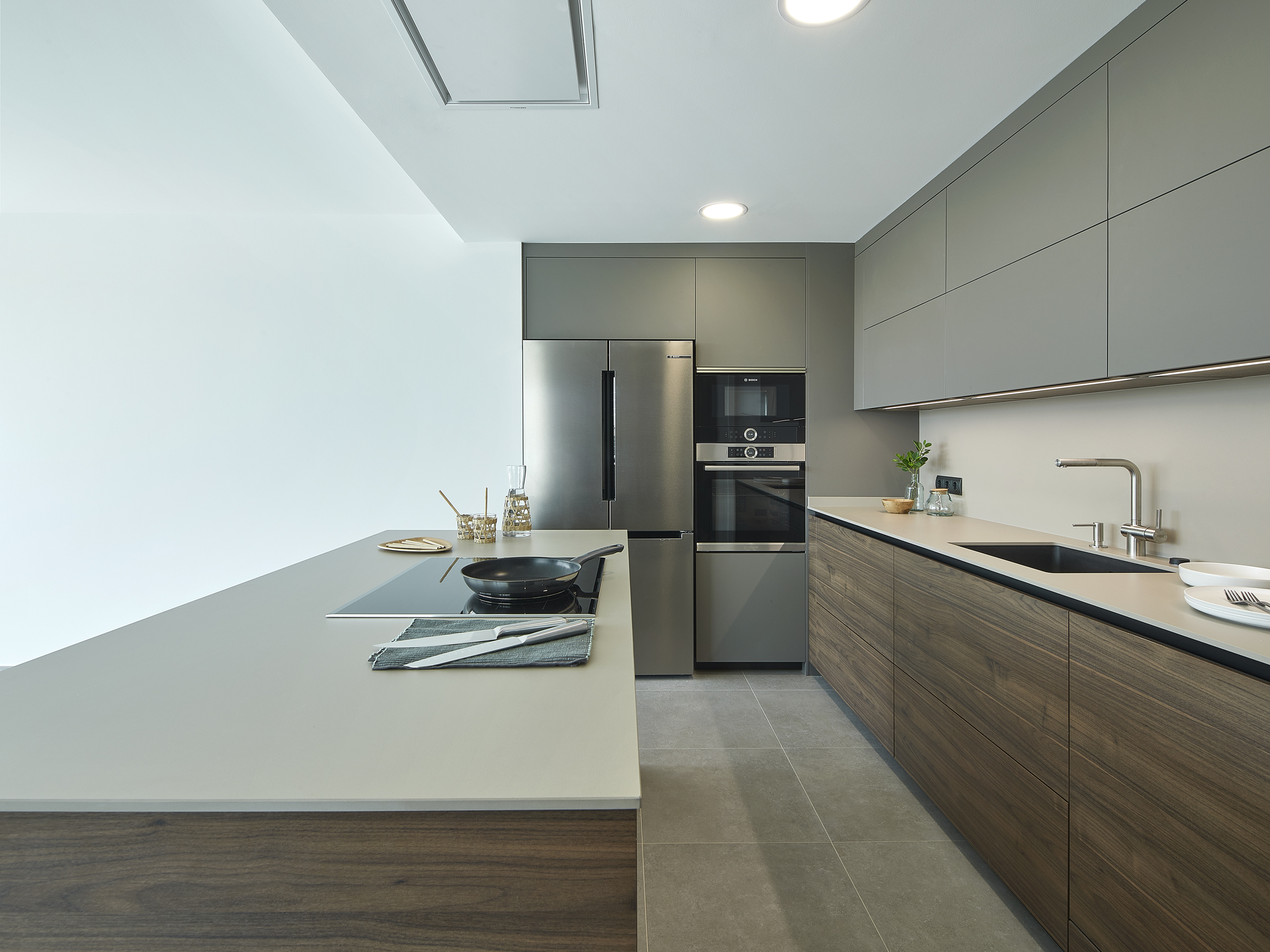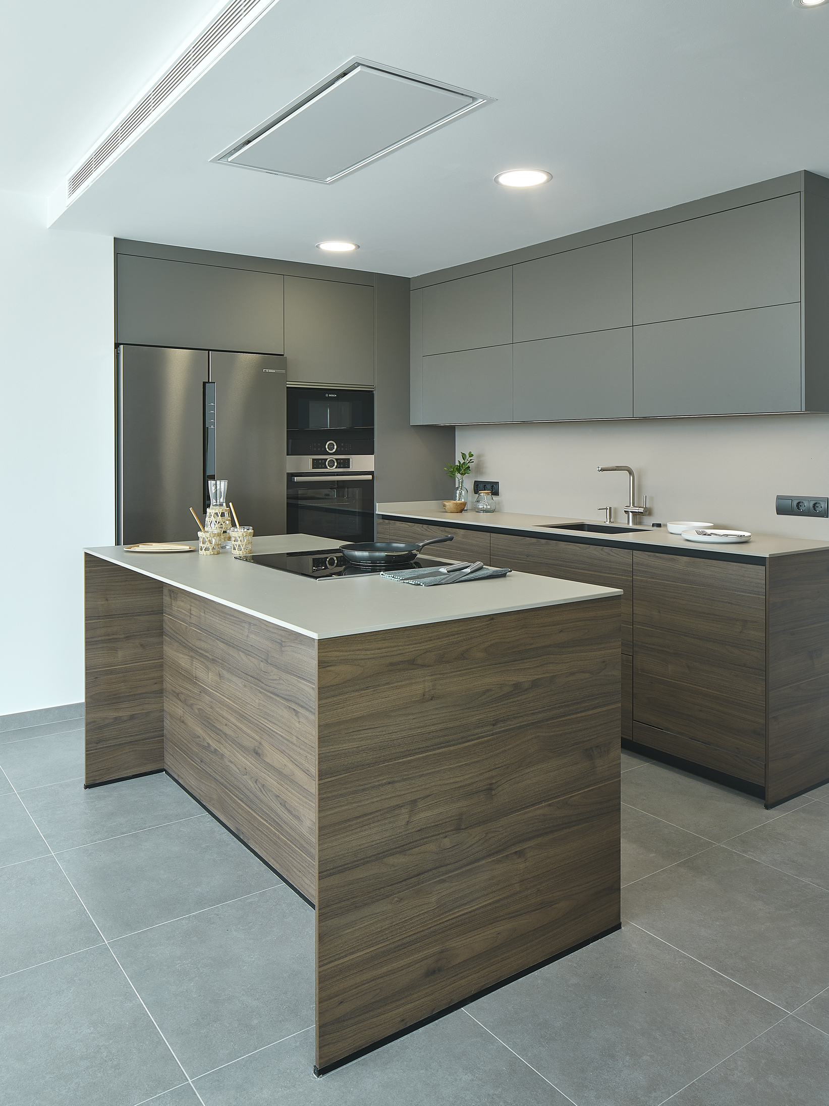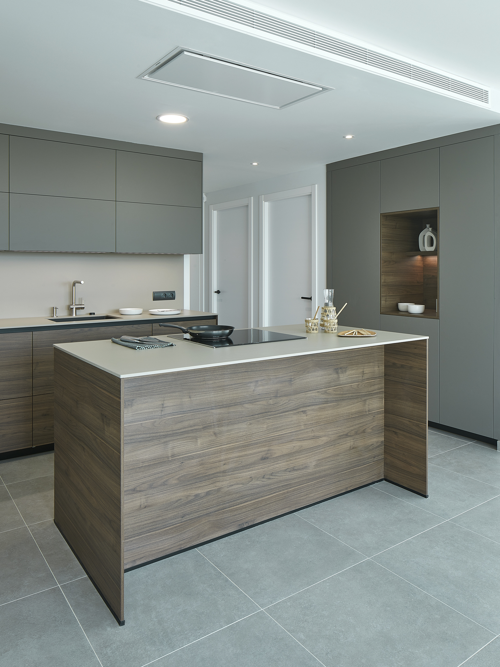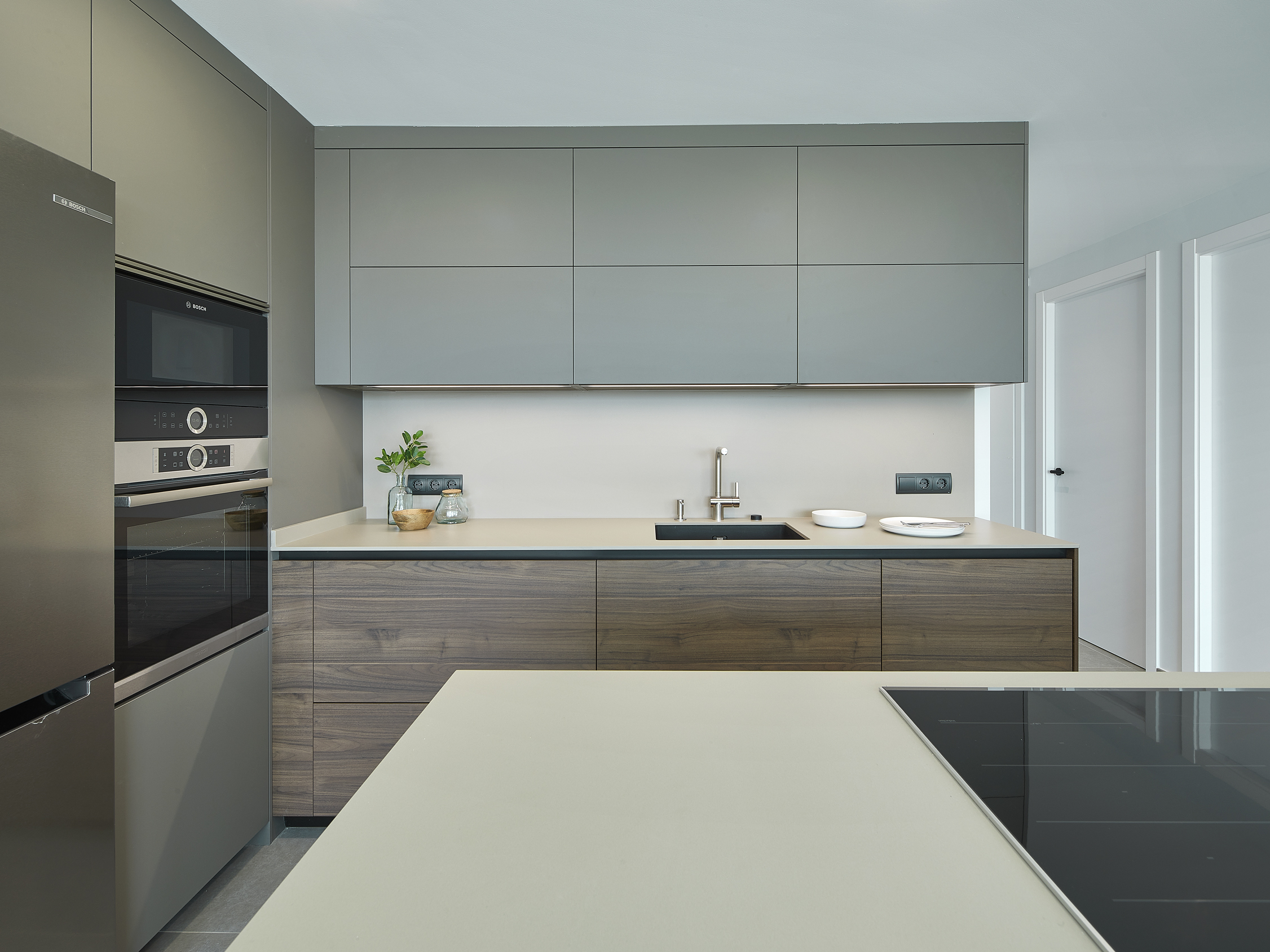 This modern kitchen is defined by a minimalist and elegant design, with a careful selection of materials and colors that create a sophisticated and welcoming atmosphere. The combination of the earthy walnut tone in the low cabinets with the mink gray of the columns and high cabinets provides a balanced contrast between warmth and modernity, giving the space a contemporary and refined aesthetic.