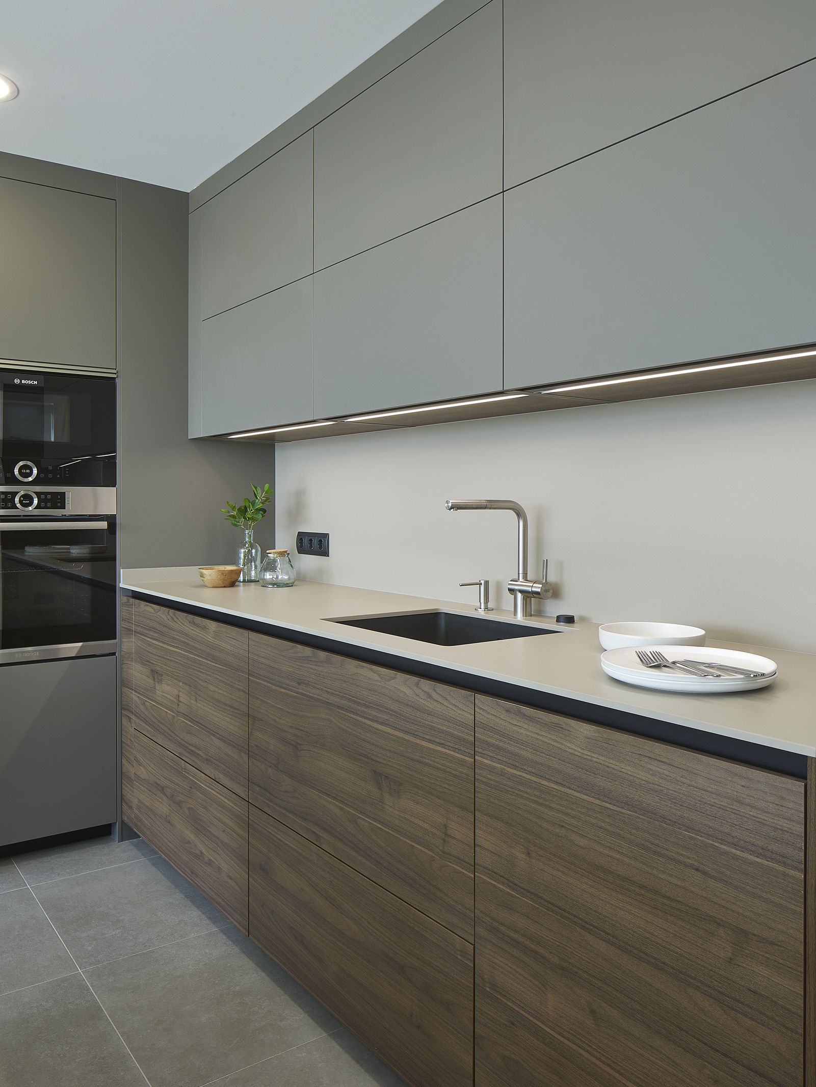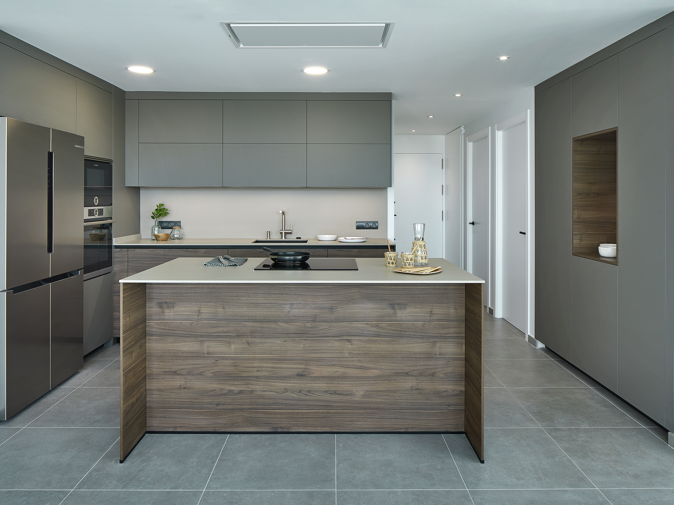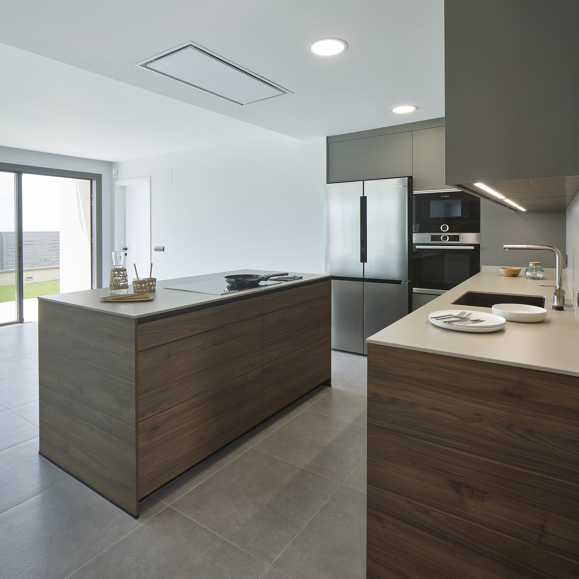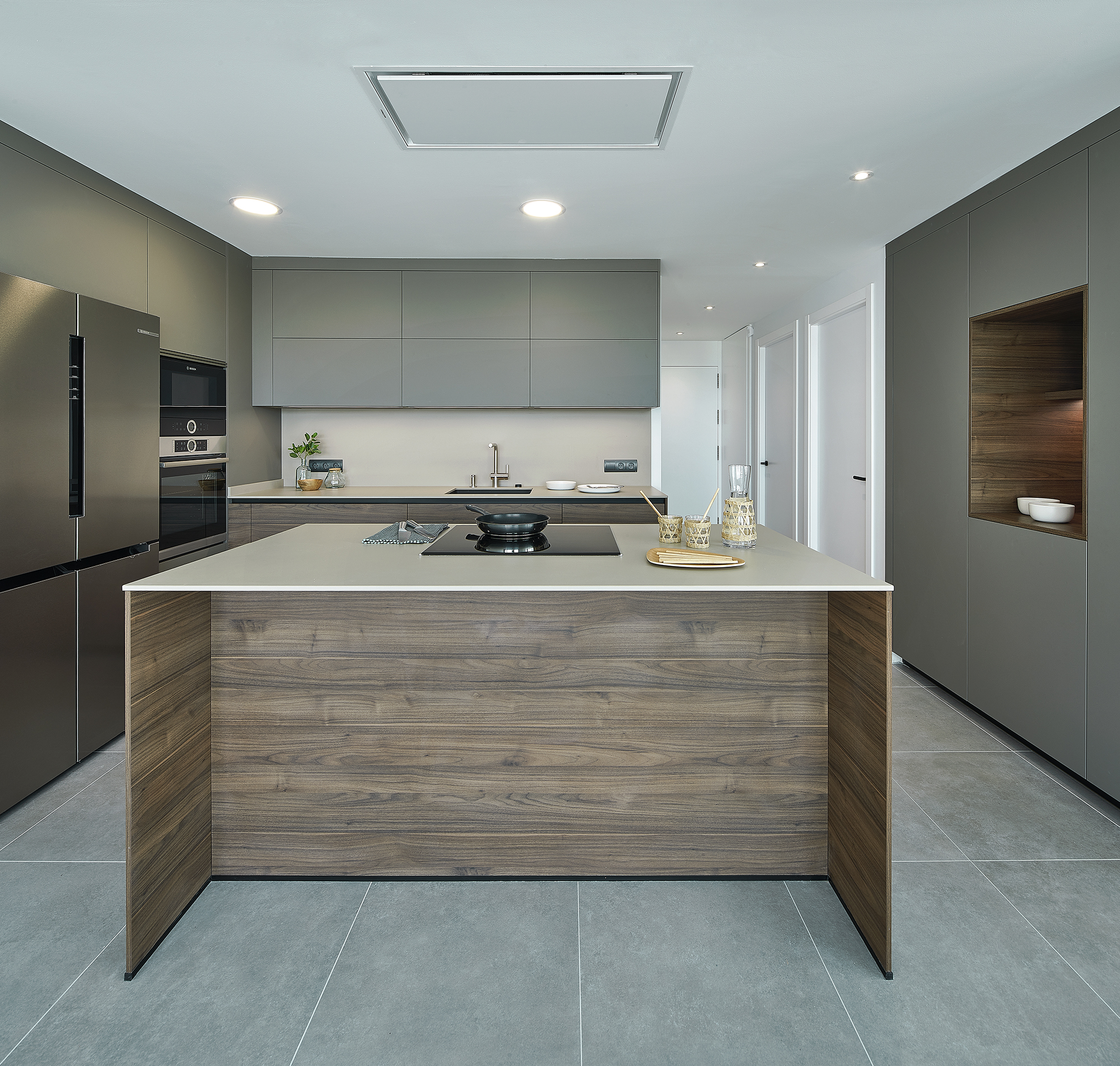 This modern kitchen is defined by a minimalist and elegant design, with a careful selection of materials and colors that create a sophisticated and welcoming atmosphere. The combination of the earthy walnut tone in the low cabinets with the mink gray of the columns and high cabinets provides a balanced contrast between warmth and modernity, giving the space a contemporary and refined aesthetic.