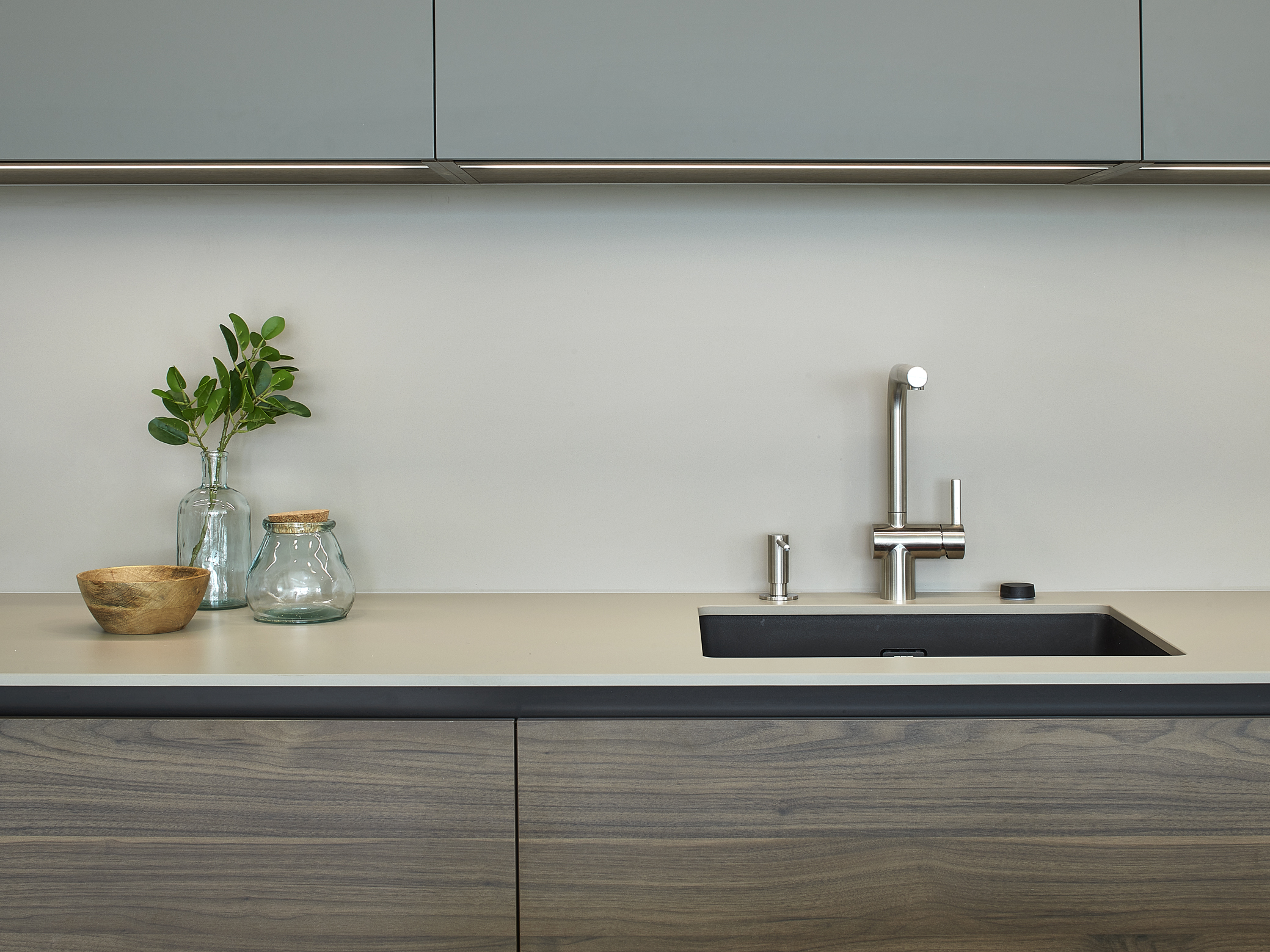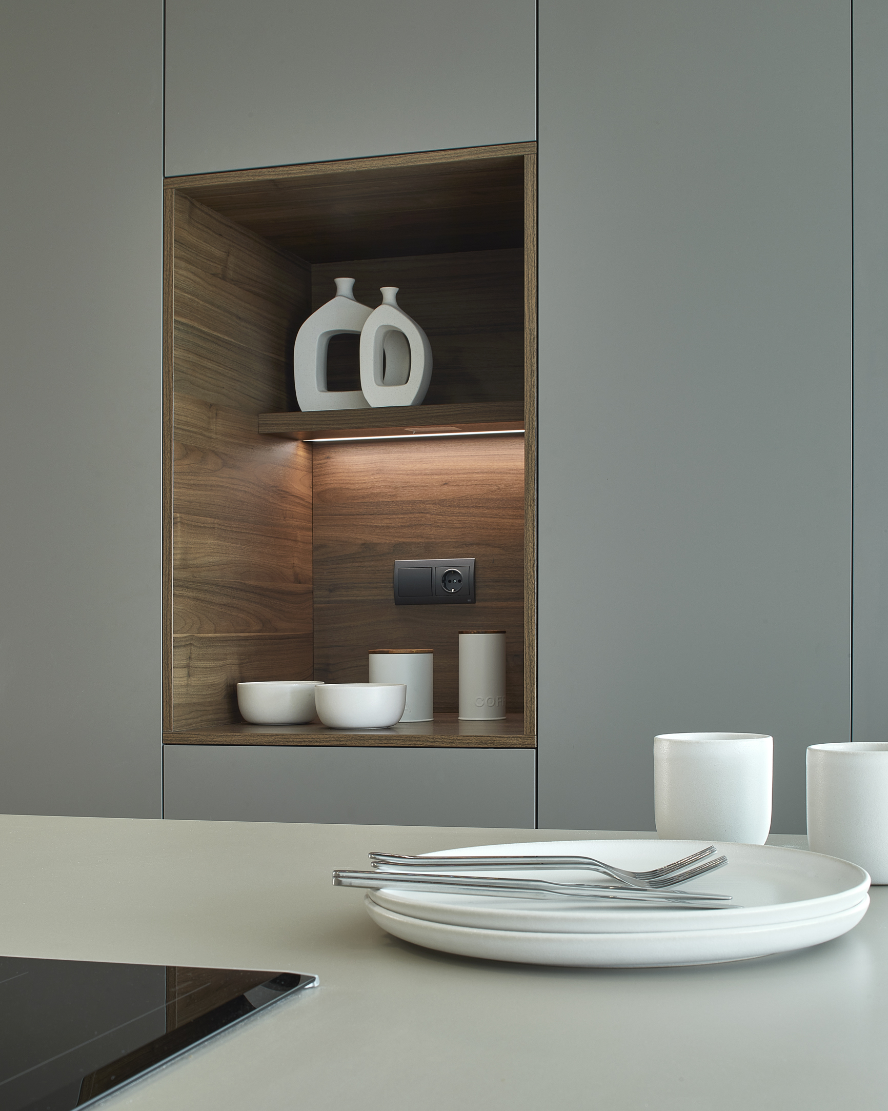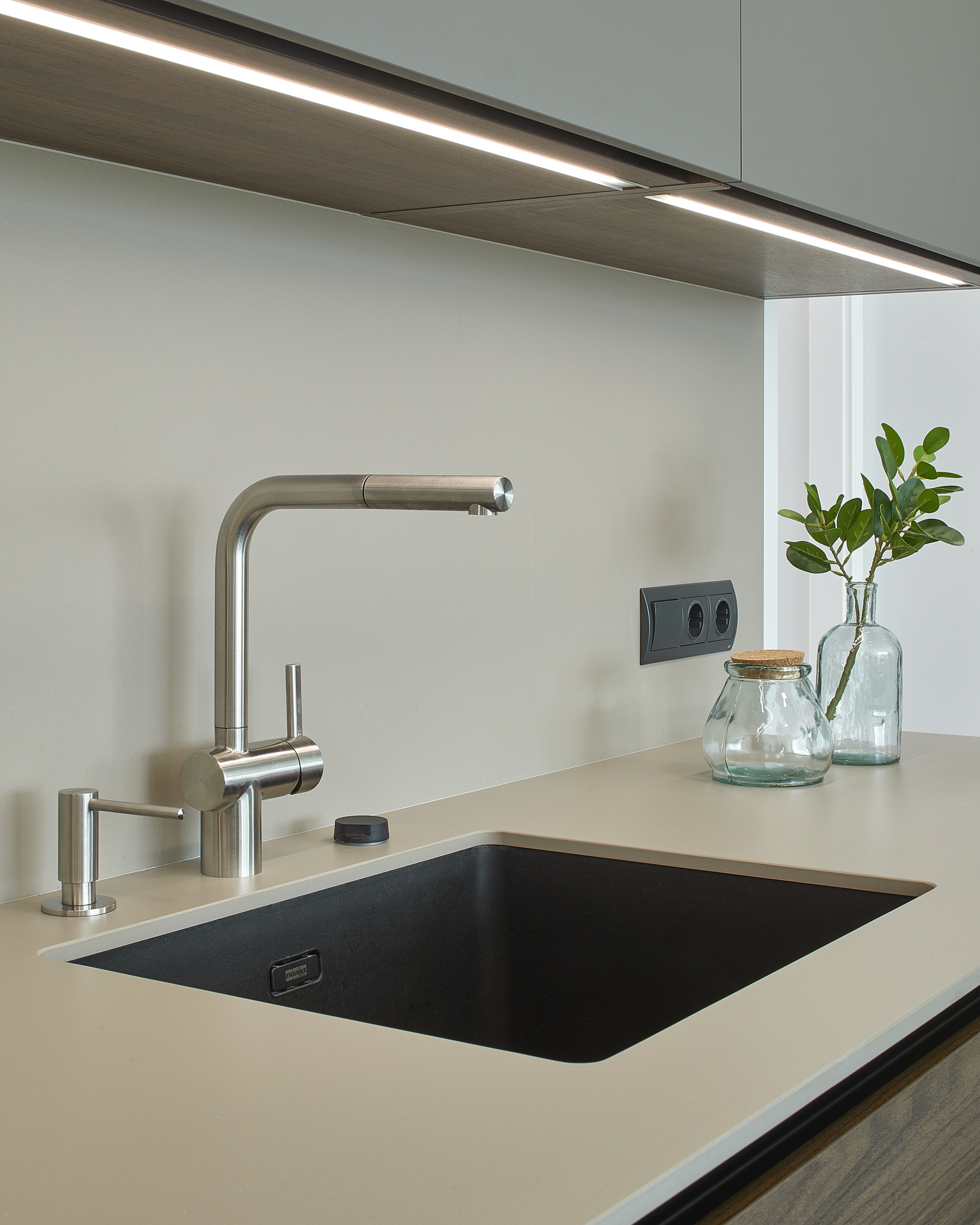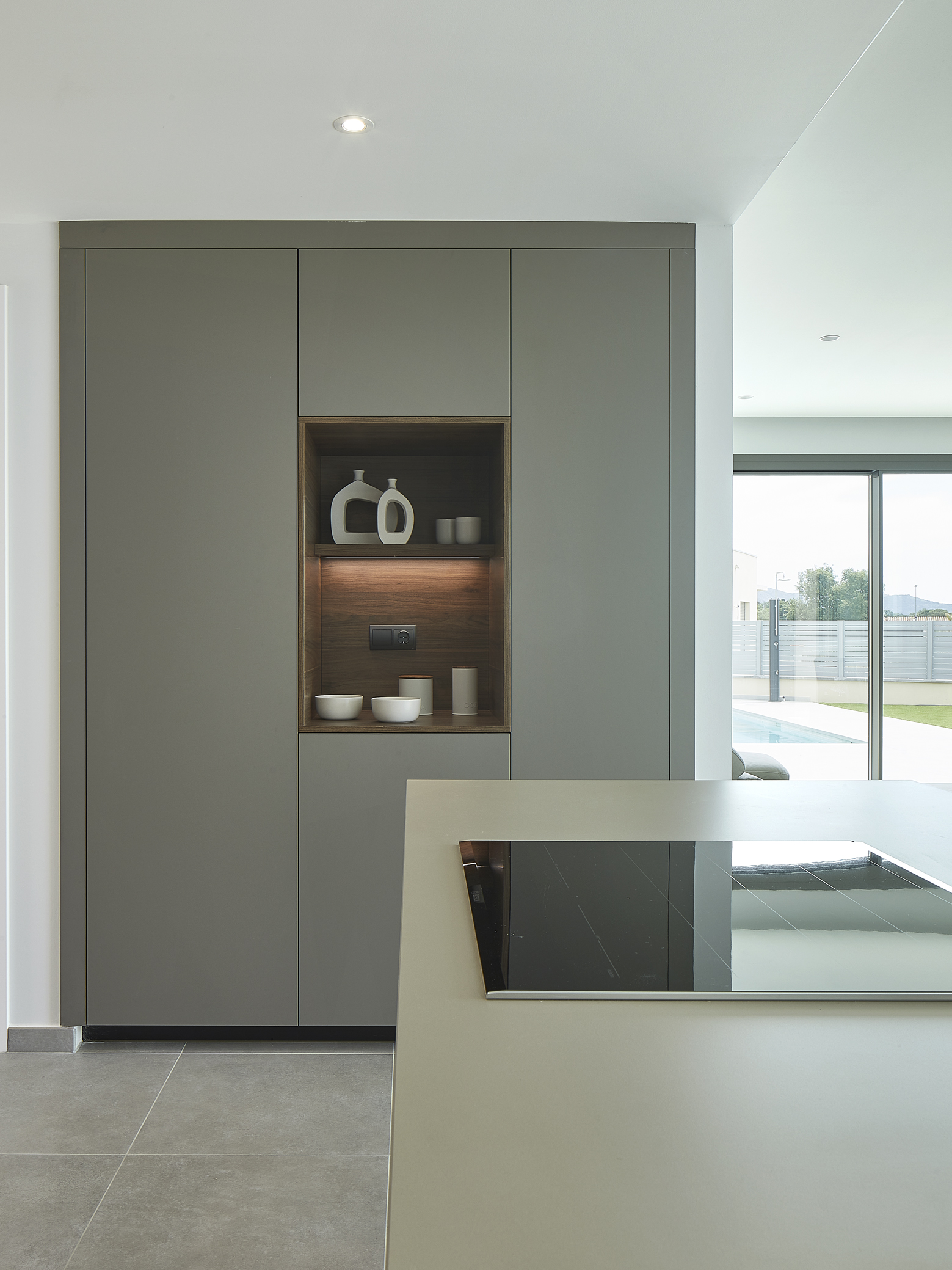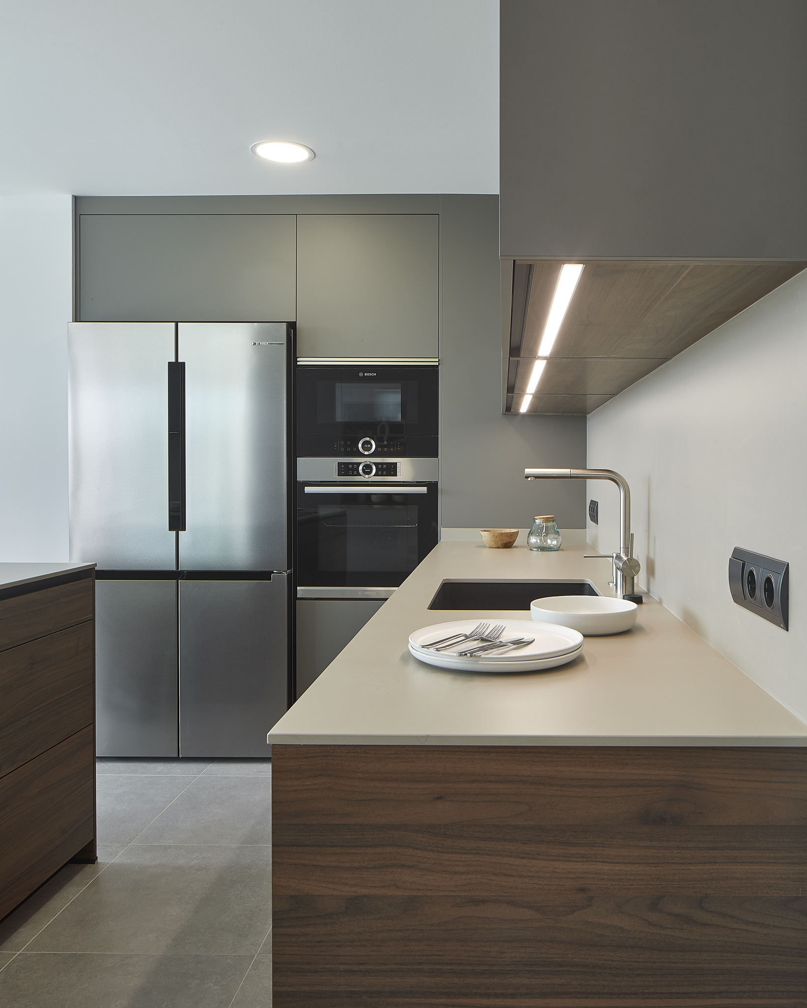 The central island, covered in earthy walnut becomes the focal point of the kitchen. In addition to functioning as a work surface, it is also a perfect space for informal meals or to interact while cooking. Its Neolith Pietra di Luna countertop provides a sober and resistant finish, which combines perfectly with the other materials and guarantees durability and easy maintenance. An induction hob is integrated into the upper part of the island , maintaining visual cleanliness and reinforcing the functional aspect of the kitchen.