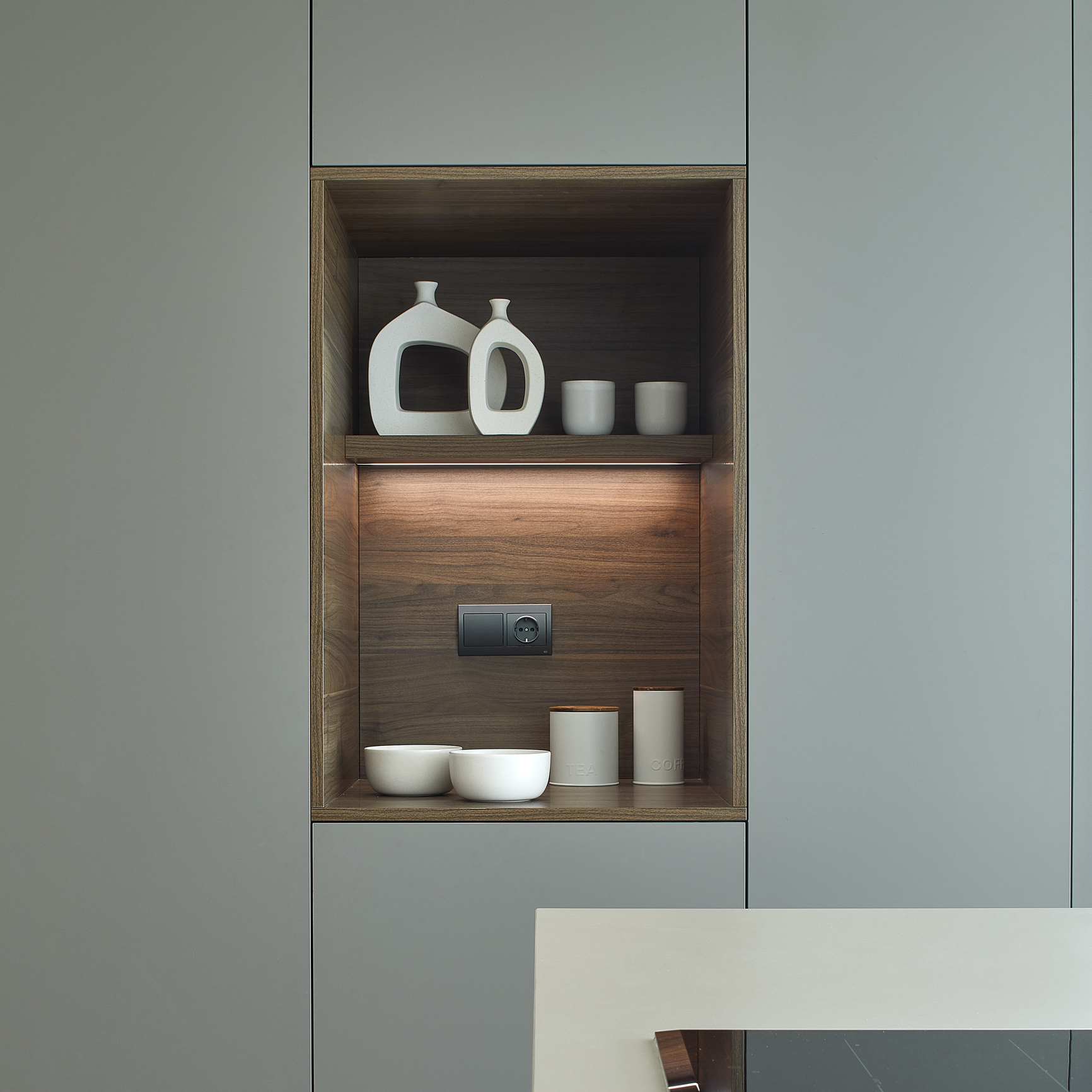 Overall, this kitchen stands out for its modernity, functionality and aesthetic balance, combining noble materials, sophisticated finishes and innovative lighting solutions to create a practical space with timeless elegance. The addition of the space dedicated to small appliances further reinforces its practicality, making it an ideal kitchen for everyday use.