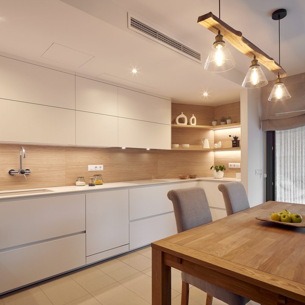 • LED lights have been installed under the upper cabinets that directly illuminate the work areas. These lights not only improve the functionality of the kitchen, providing good visibility for preparation tasks, but also add a warm and welcoming atmosphere to the space.