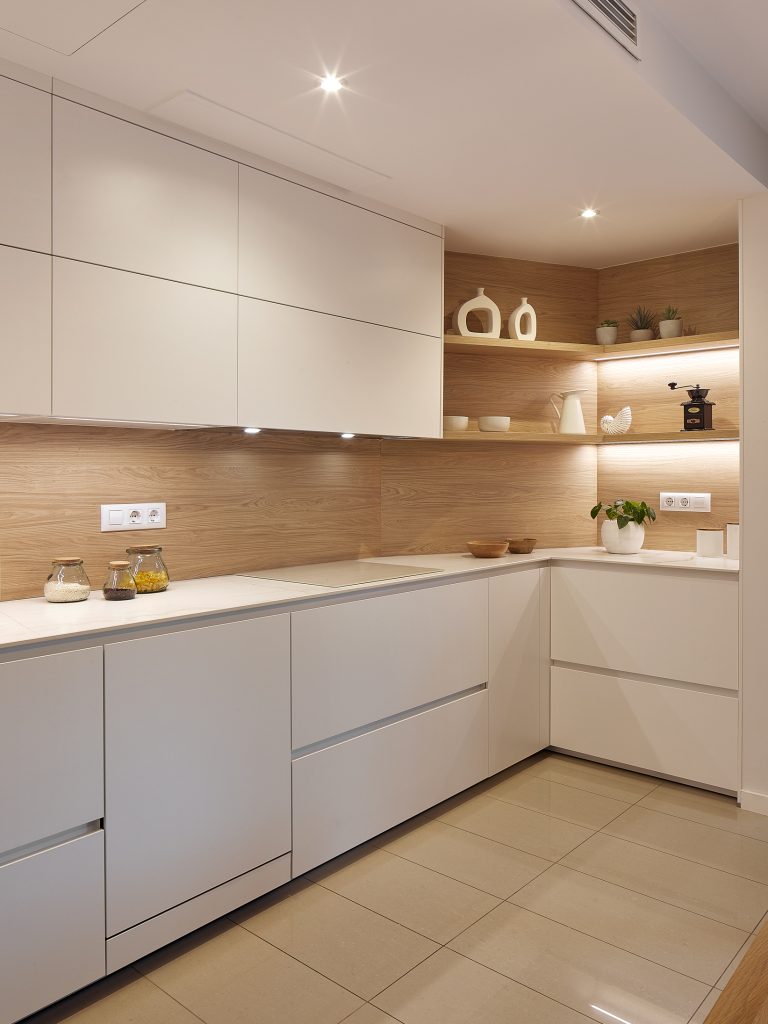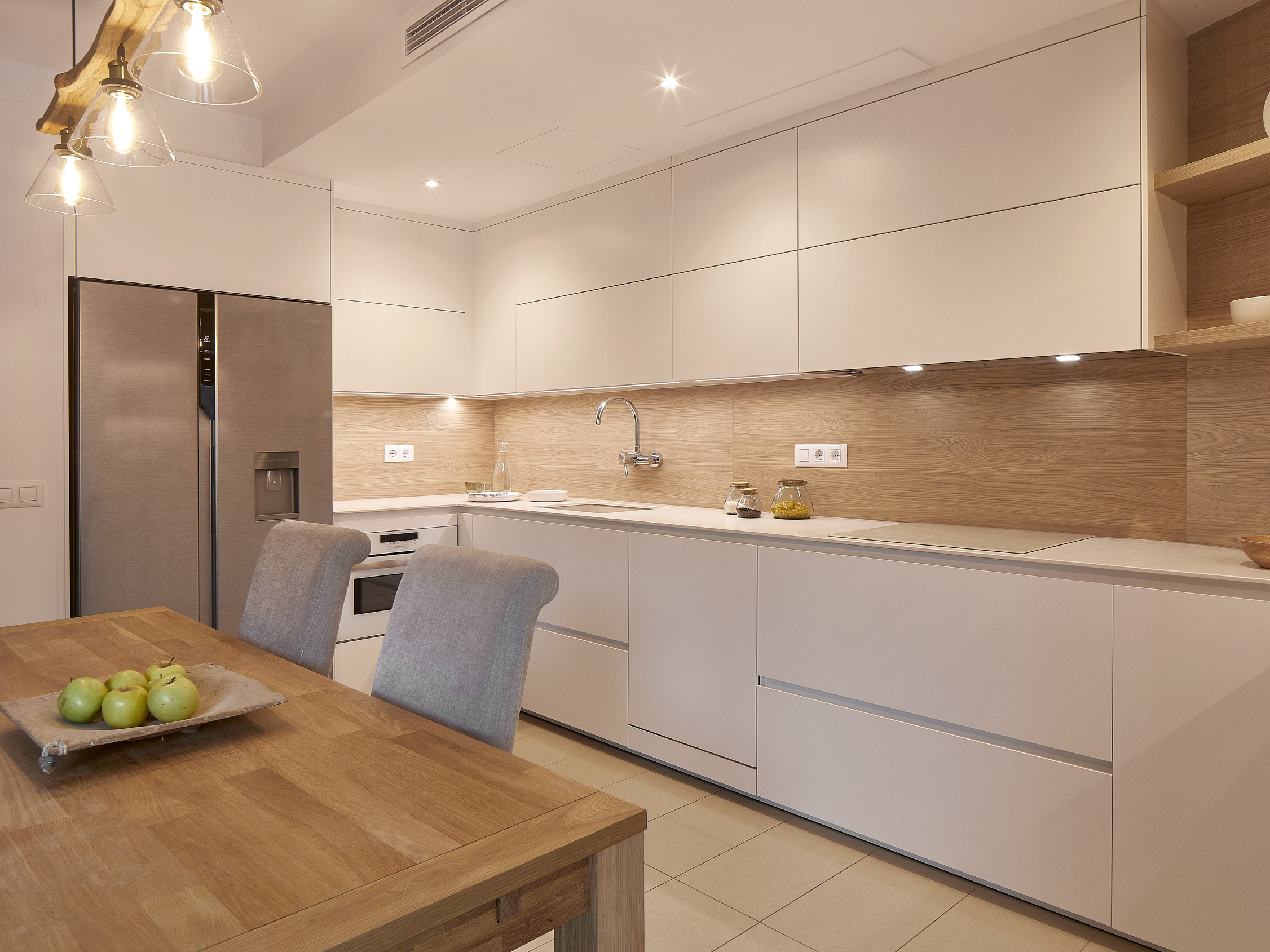 This kitchen in Blanco Seff and Roble Claro Sincro colors is a perfect example of a modern and minimalist design, which is both functional and welcoming. The combination of white with light wood creates a bright and calm atmosphere, while details such as integrated lighting and Neolith Montblanc surfaces add elegance and sophistication. Clean lines, the absence of visible handles and the integration of modern technology complete this design, making it both practical and aesthetically pleasing.