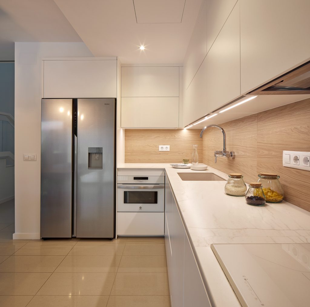 • The Neolith Montblanc countertop stands out for its durability and smooth finish, which combines perfectly with the rest of the kitchen, maintaining consistency in the light and bright tones.