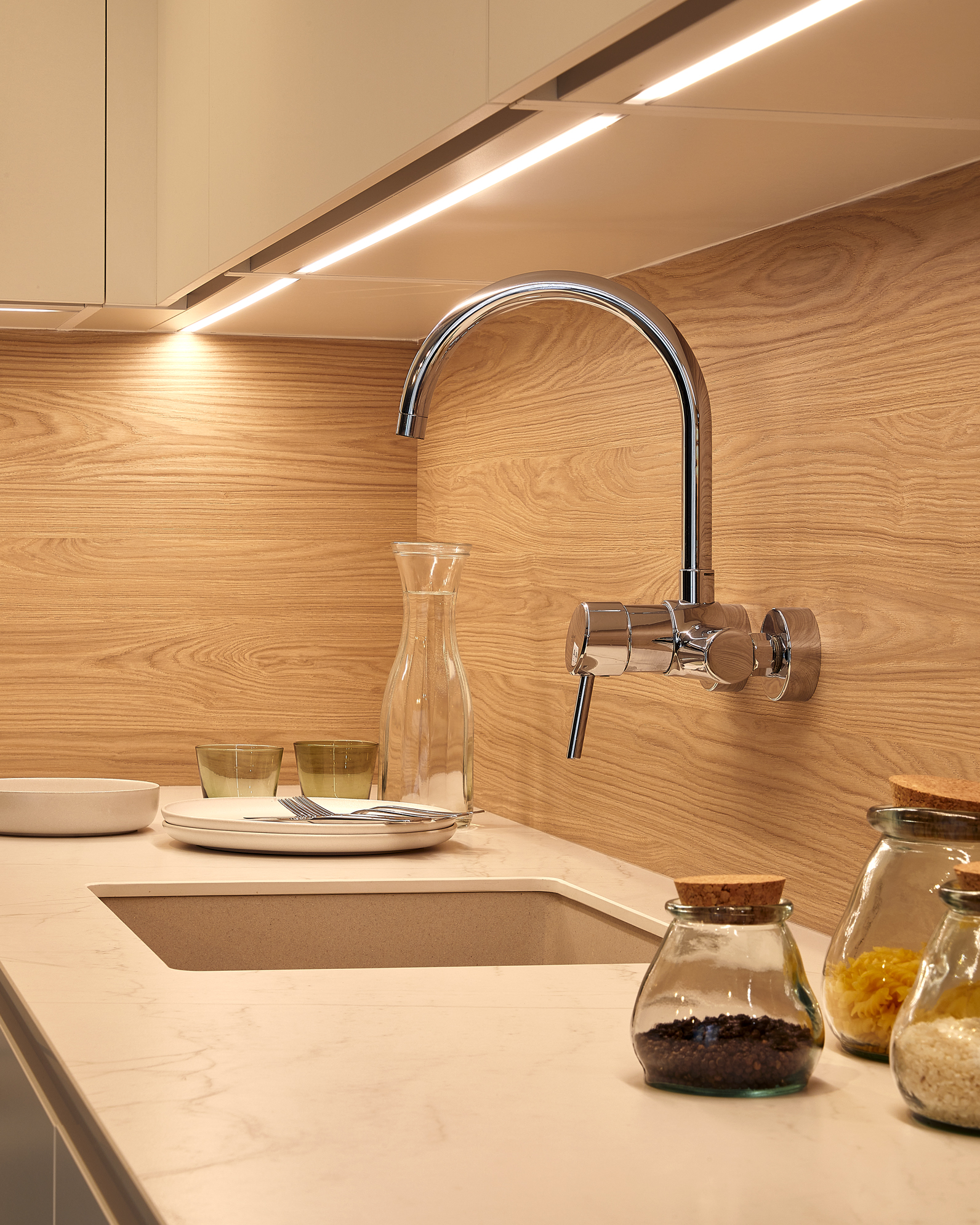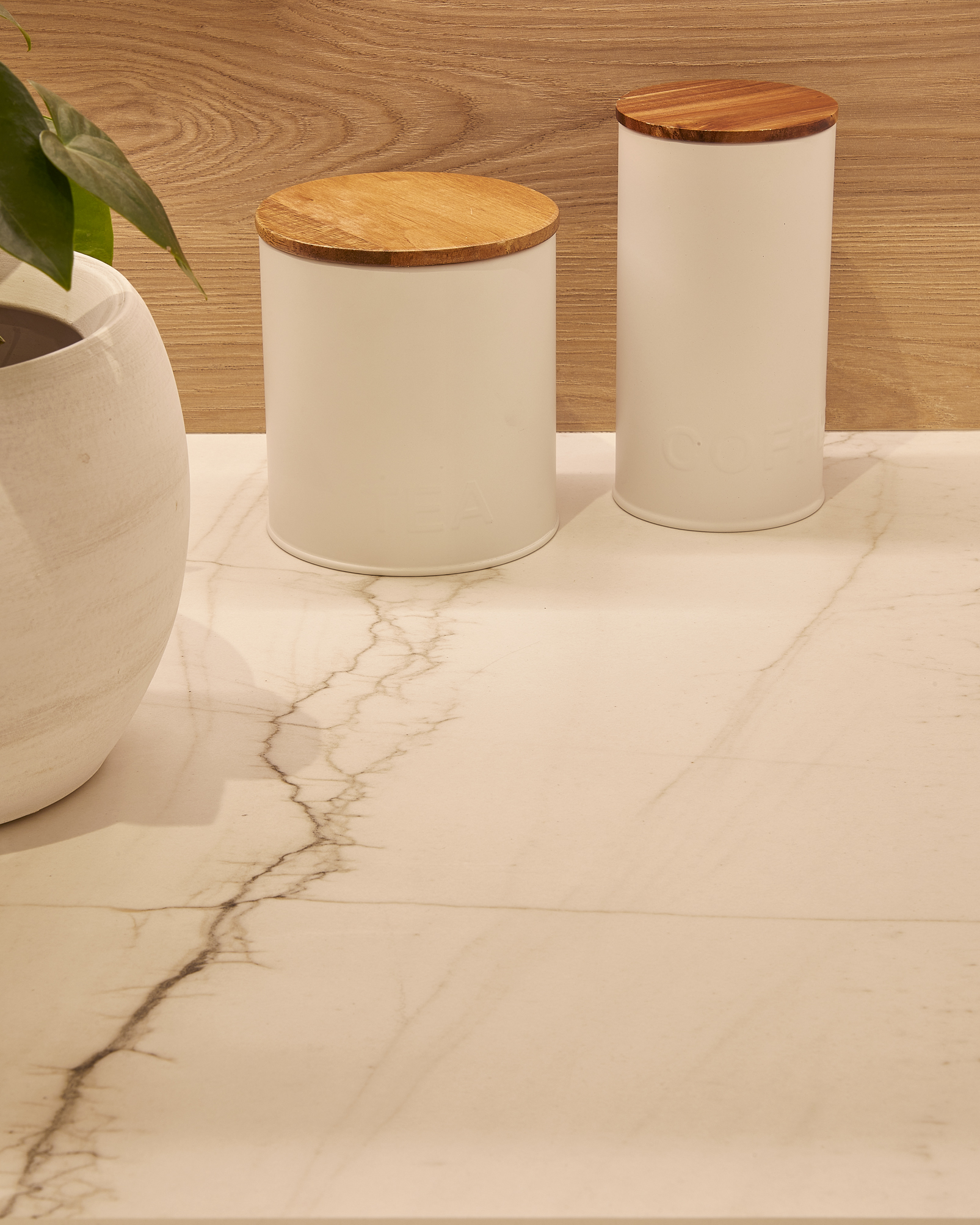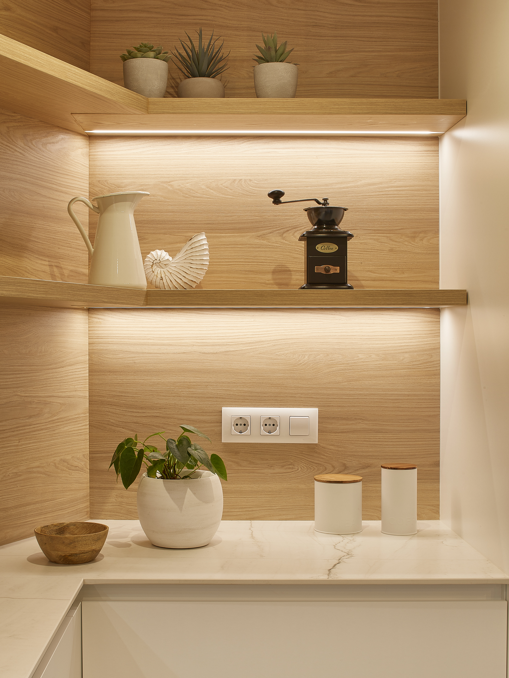 • The open shelves , in addition to being functional, are also a decorative element. Neolith Montblanc Countertop The countertop is made of Neolith Montblanc , an ultra-compact material that imitates white marble. This material is very resistant and practical for daily use. Its light color with subtle veins adds a touch of luxury and elegance, complementing the simplicity of the Seff white and the natural touch of oak wood.