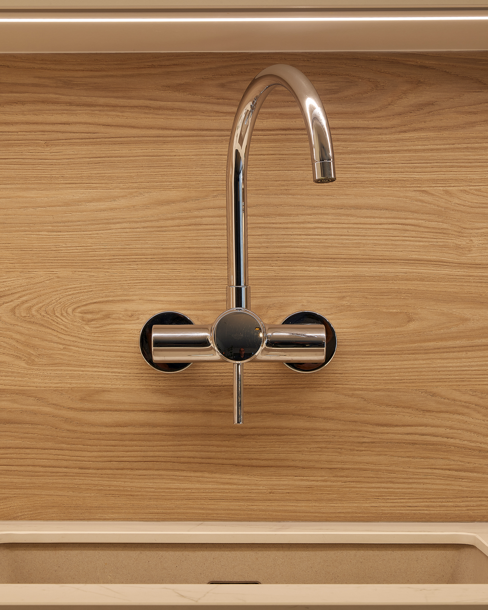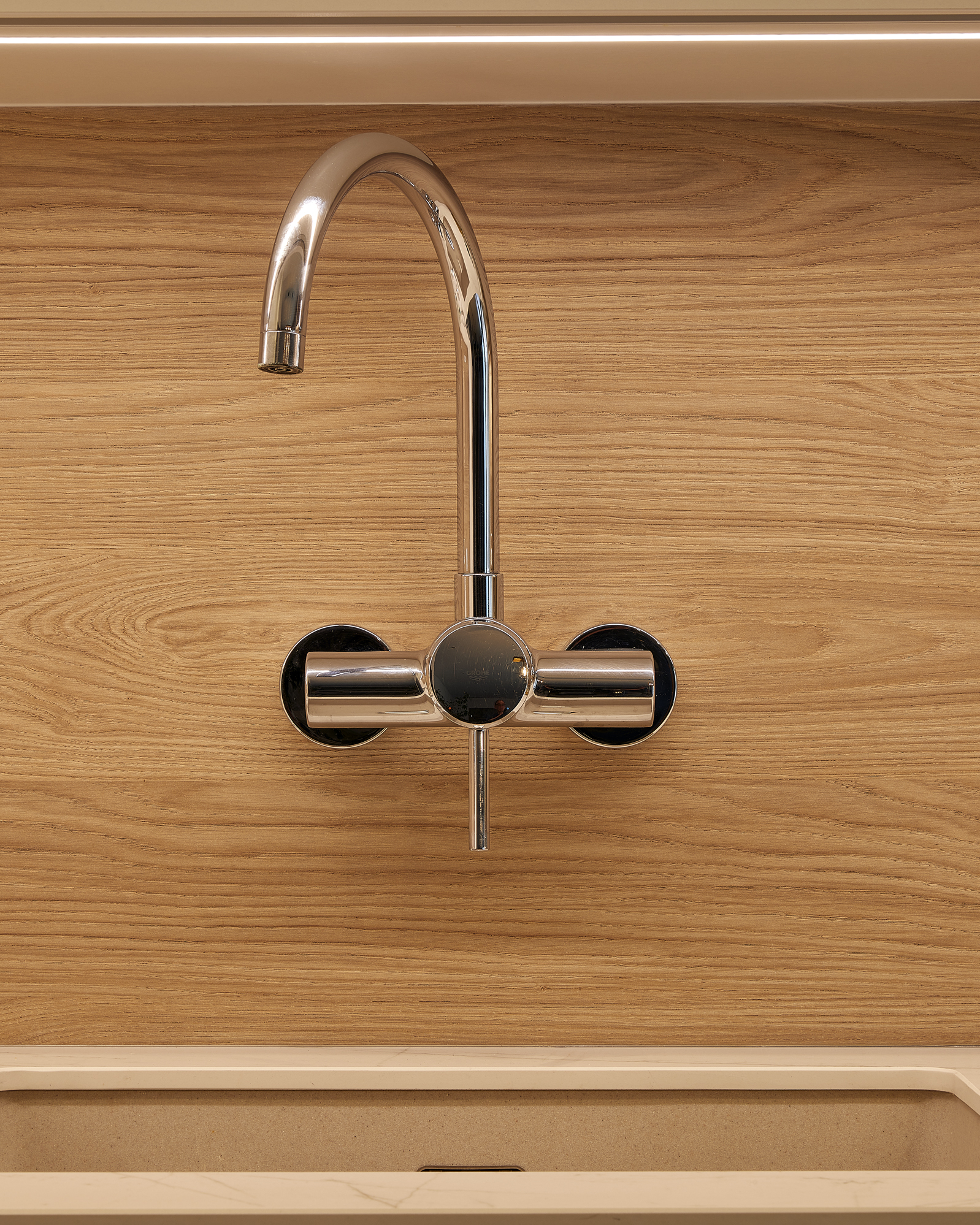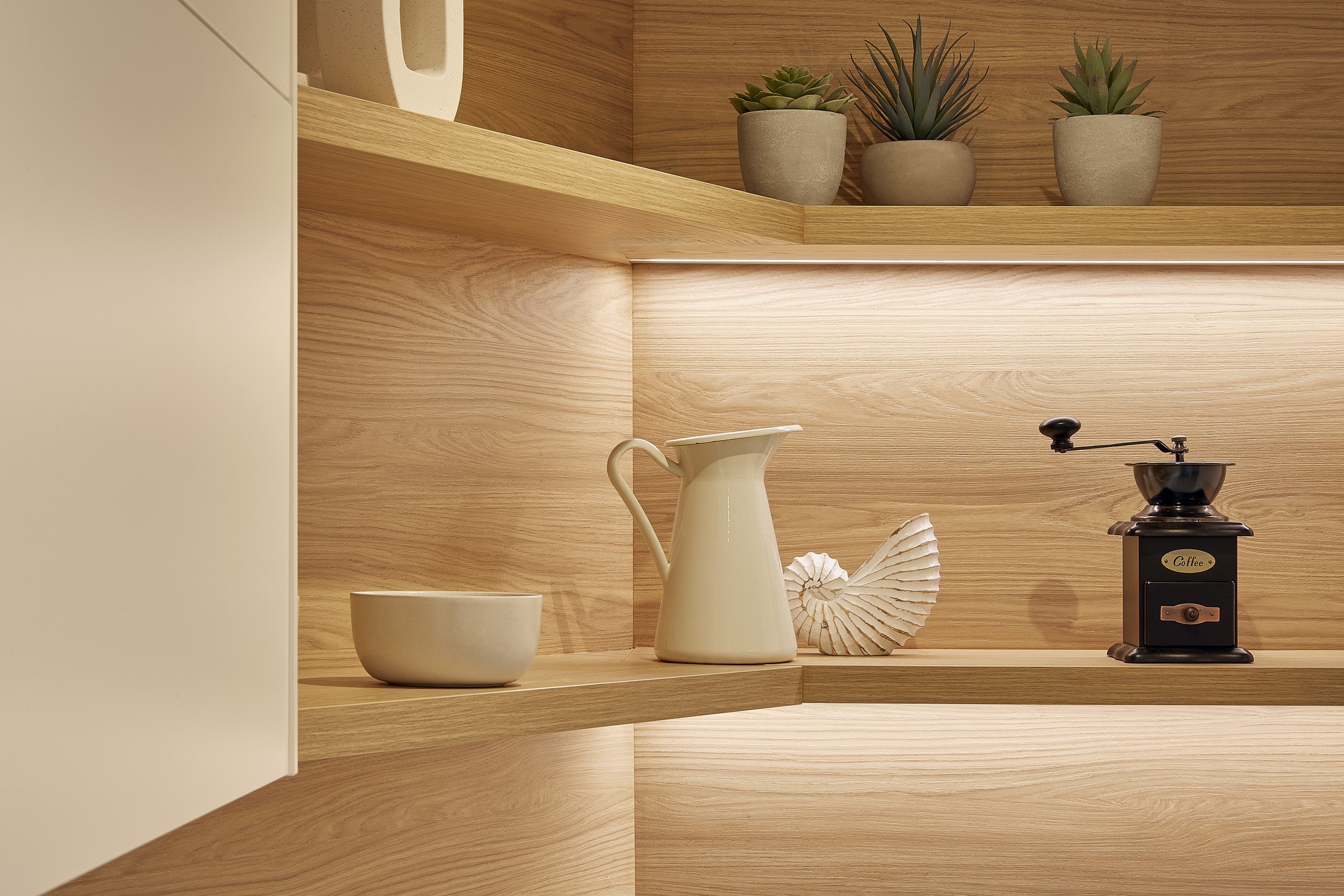 • Light Sincro Oak appears on both the back wall cladding and the open corner shelves . This wood has a soft, natural grain, which adds warmth and contrast to the predominantly white kitchen. The light tone of this wood creates a welcoming and harmonious atmosphere, softening the minimalism of the white.