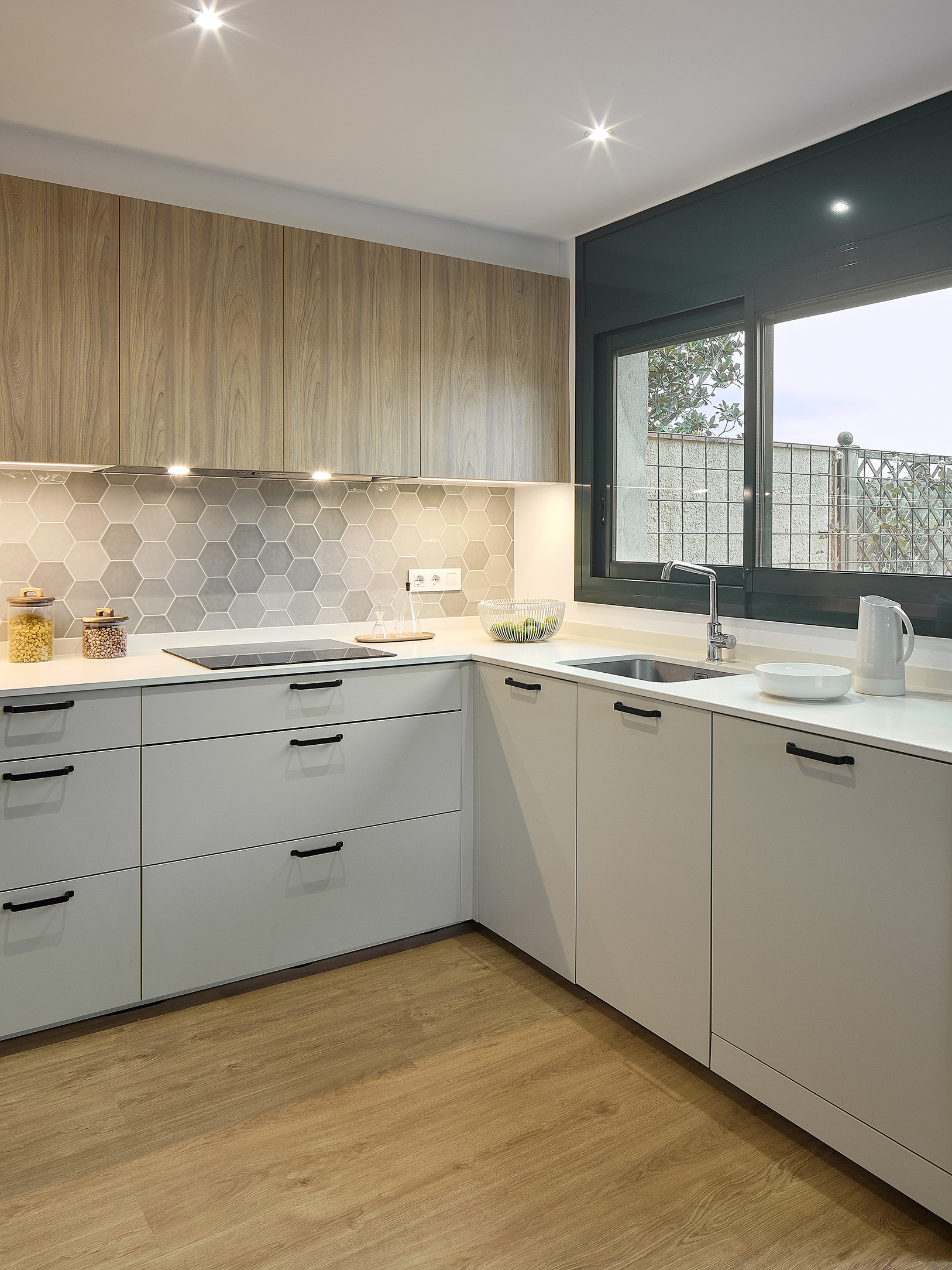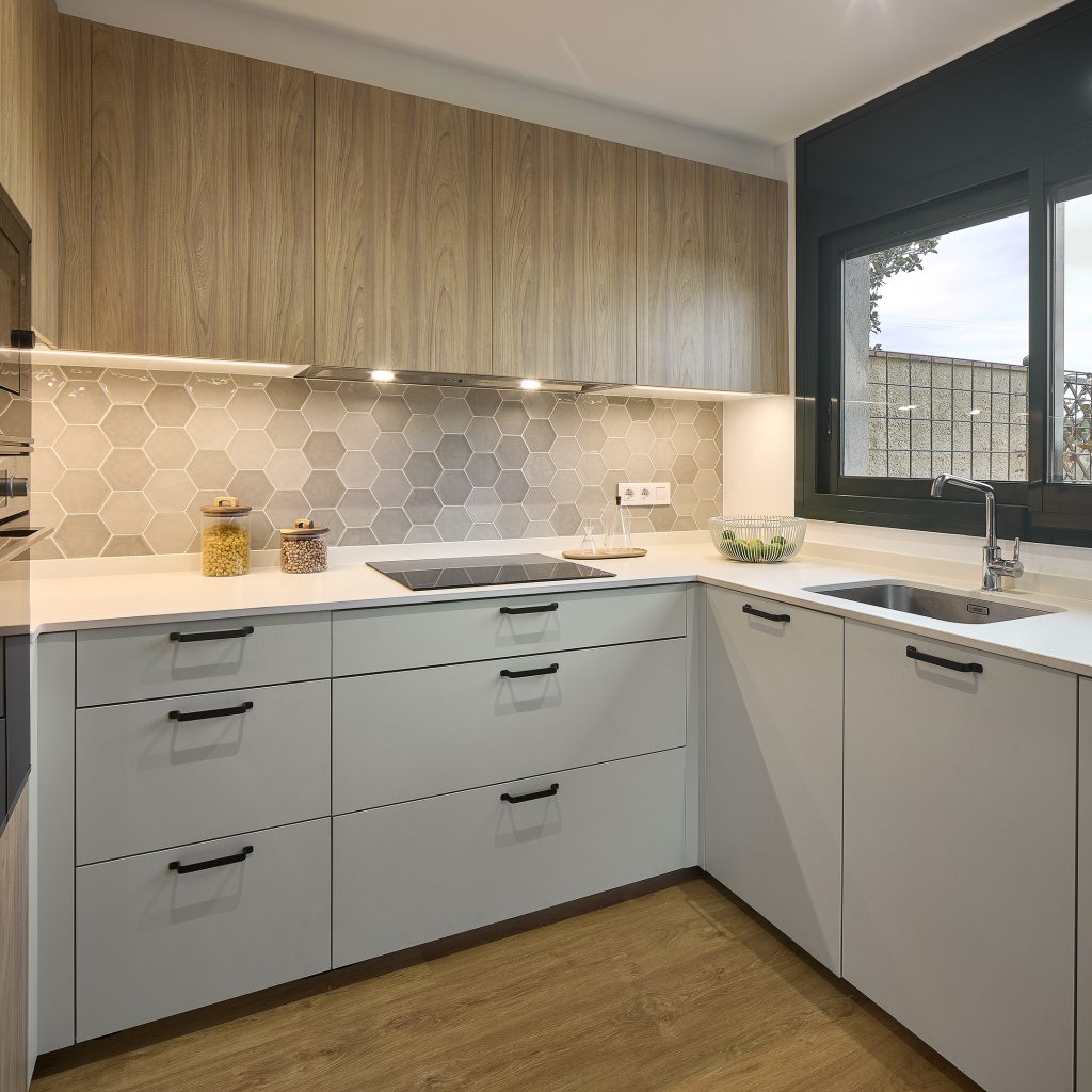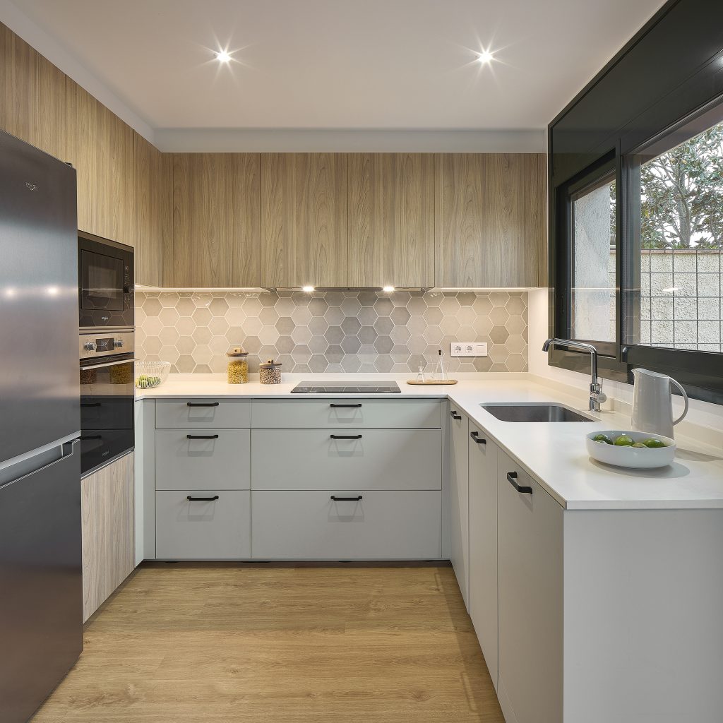This kitchen stands out for its contemporary and functional design, combining the warmth of natural materials with the modernity of neutral tones and minimalist finishes. The chosen colors and textures, together with an ergonomic layout, create a balanced, cozy and practical space for everyday life.