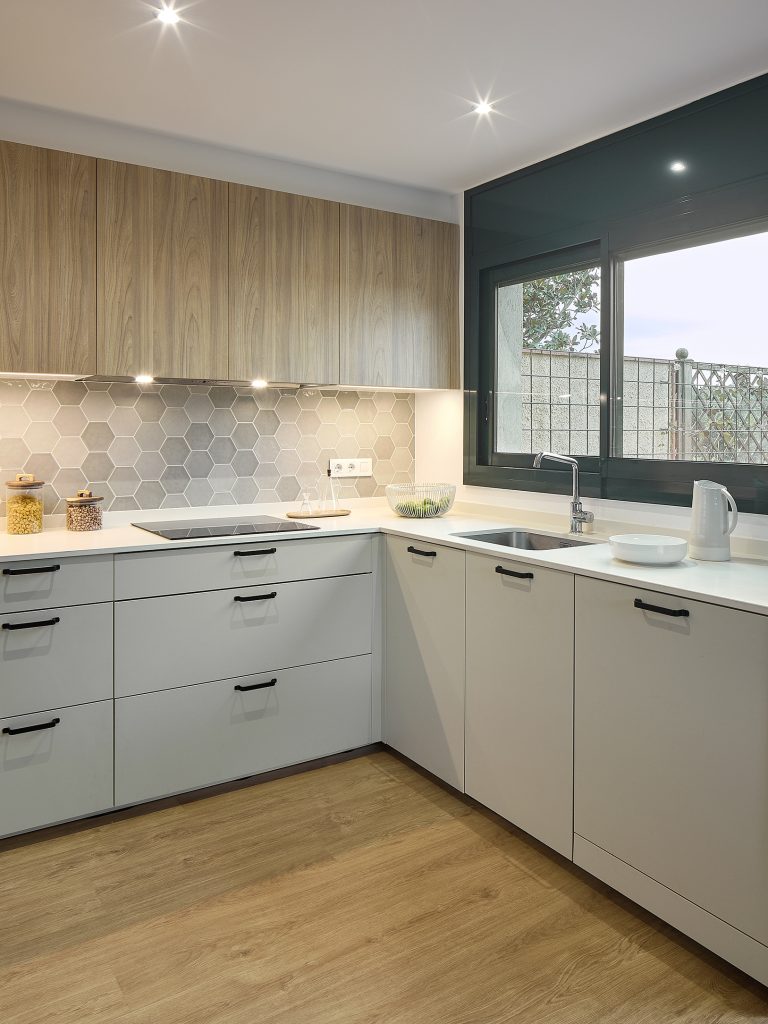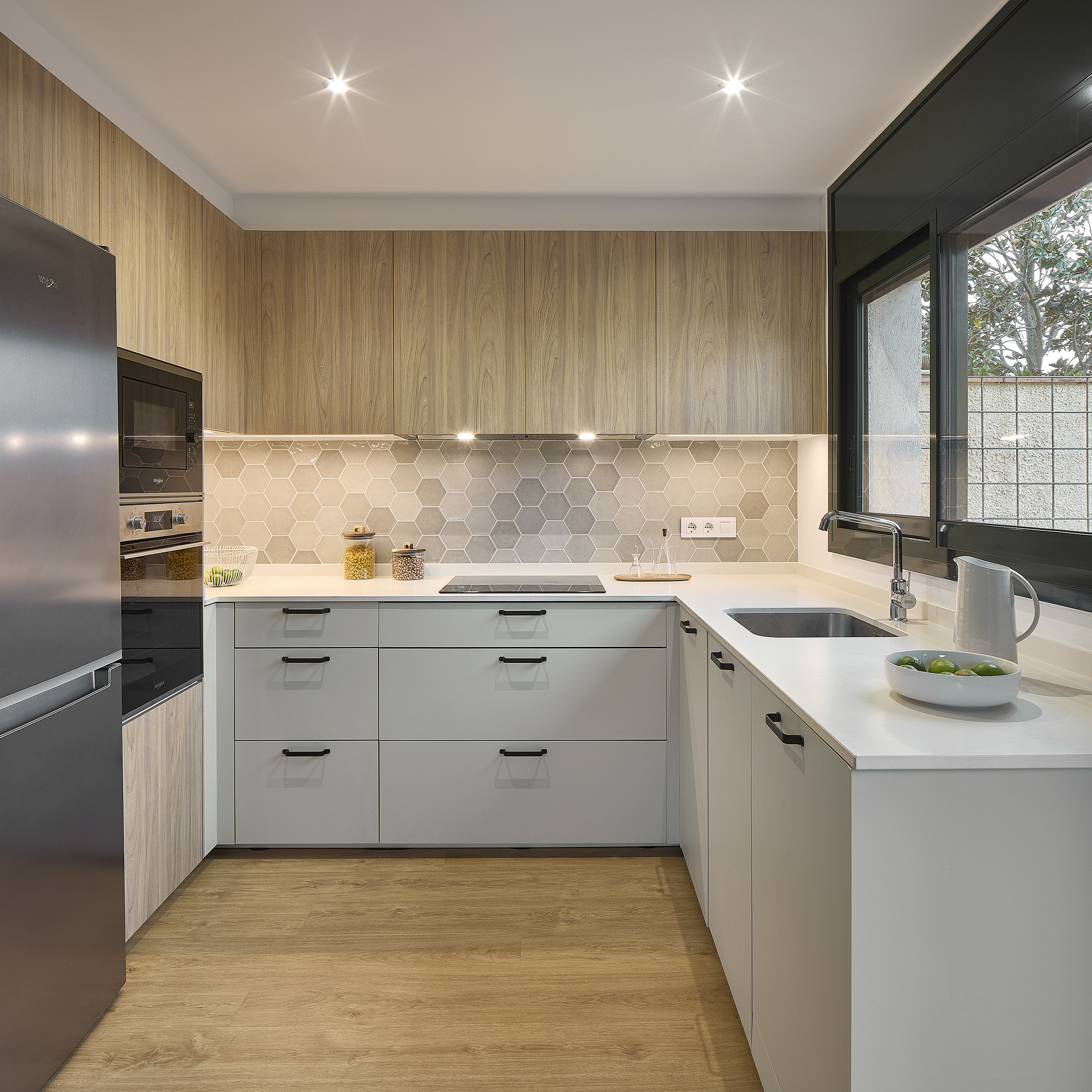 This kitchen is an example of a balance between functionality and aesthetics. The neutral tones of gray and white combine harmoniously with the warm texture of the wood, creating a cozy and elegant space. The black details add character, while the quality materials ensure durability and ease of maintenance. It is a kitchen designed to be enjoyed both in the preparation of meals and in daily coexistence.