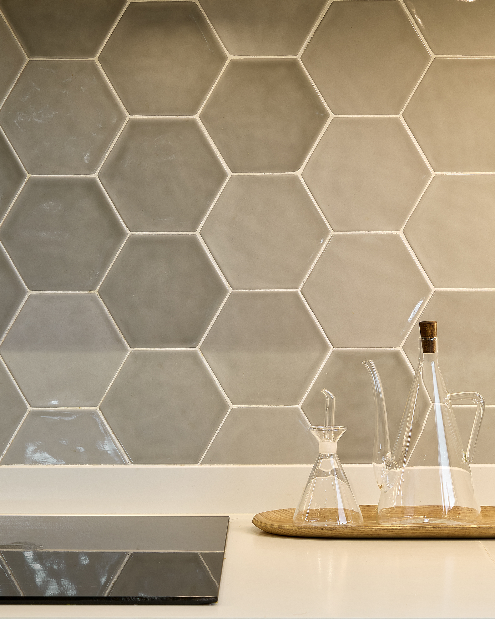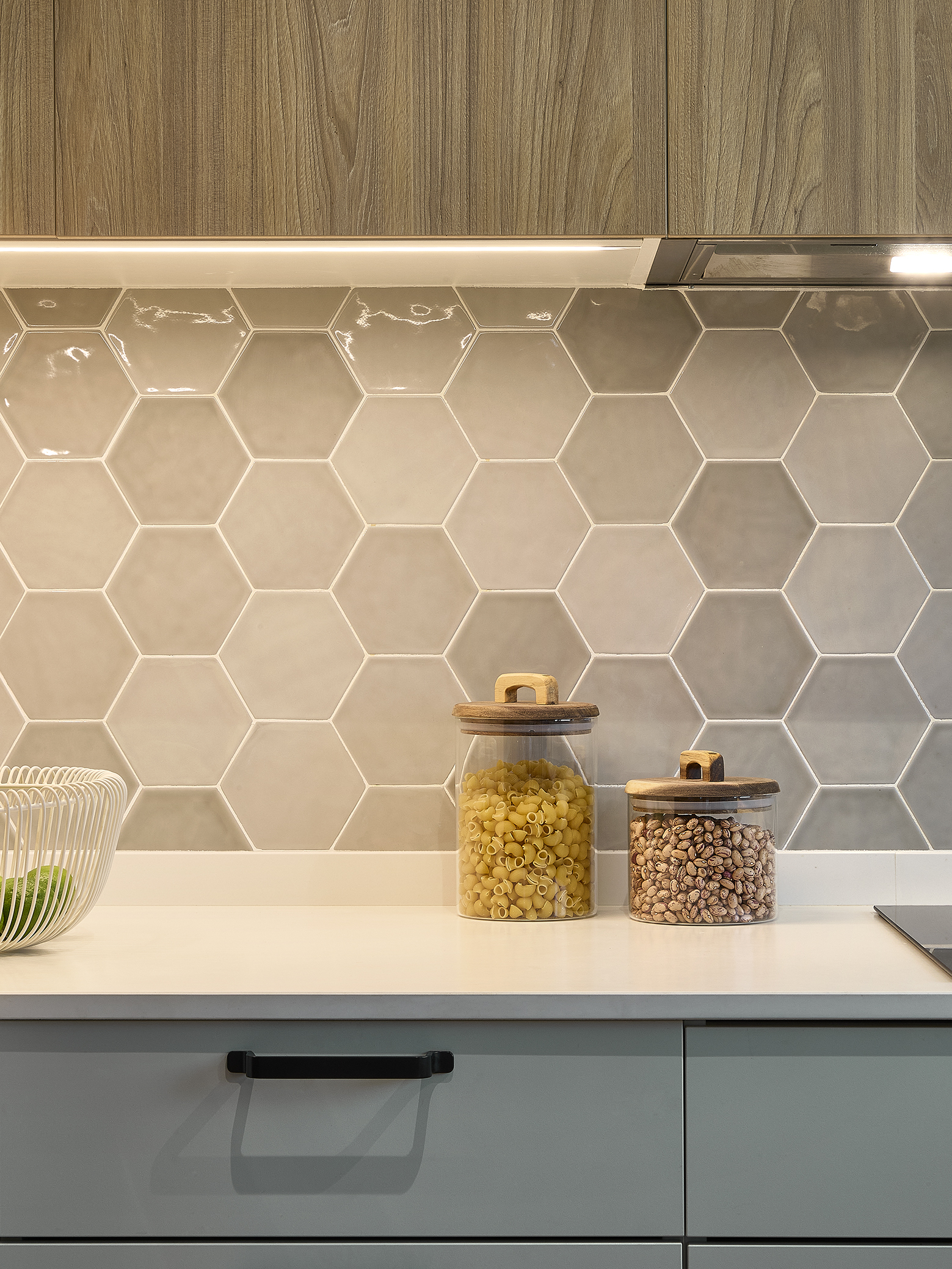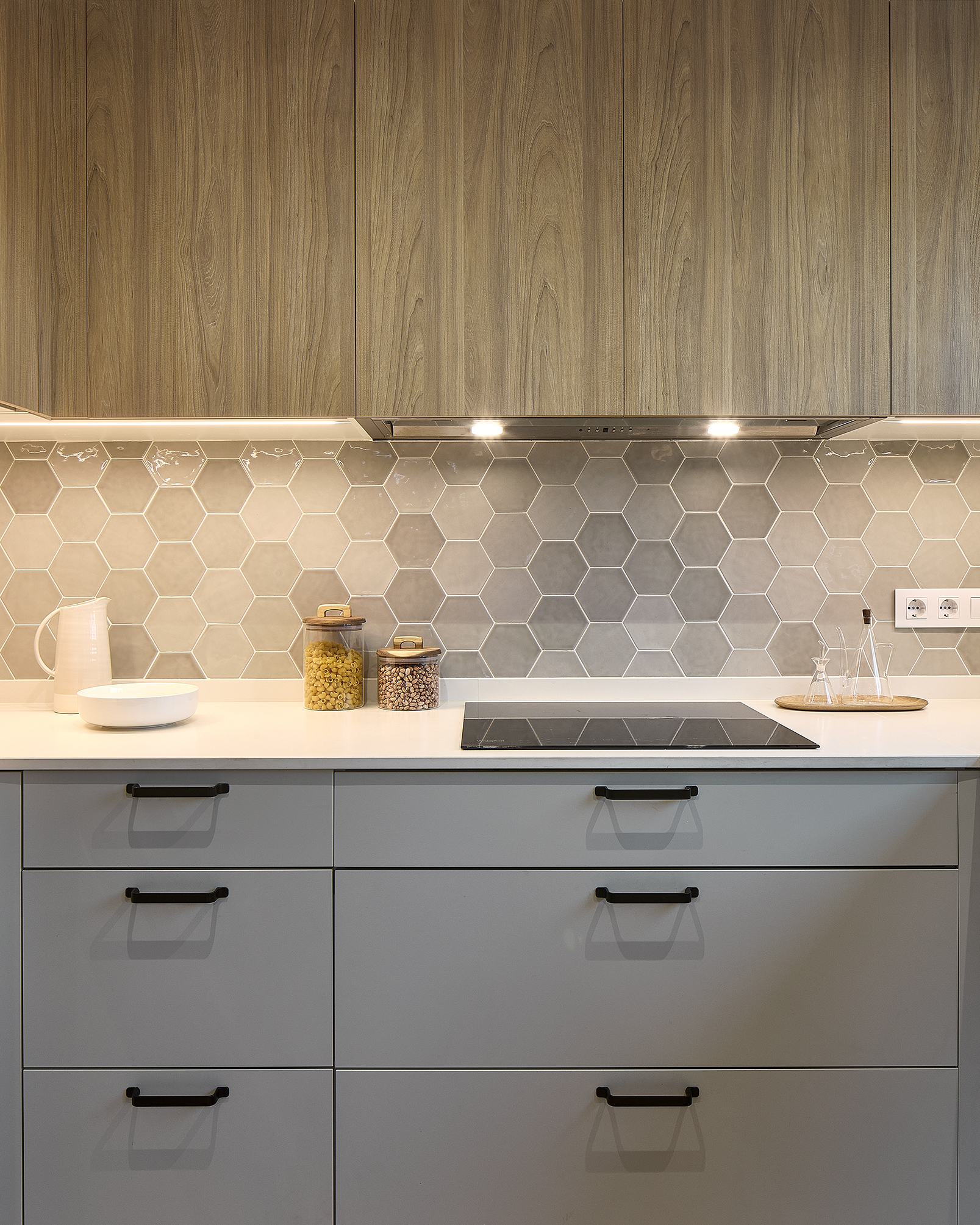 The front is covered with hexagonal tiles in gray tones chosen by the client, which bring visual dynamism and a modern touch to the kitchen as a whole.