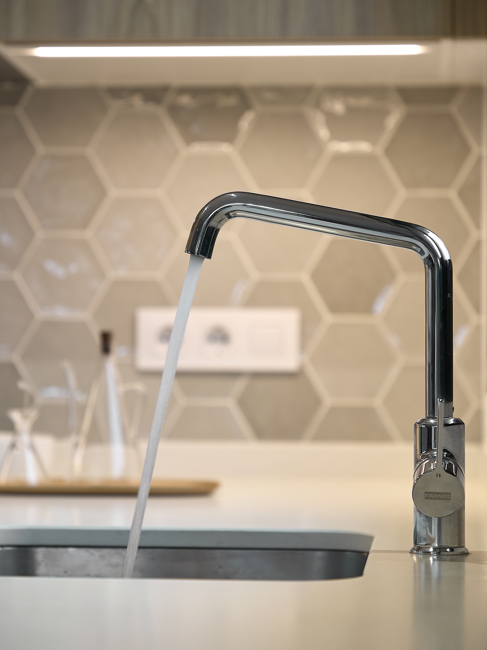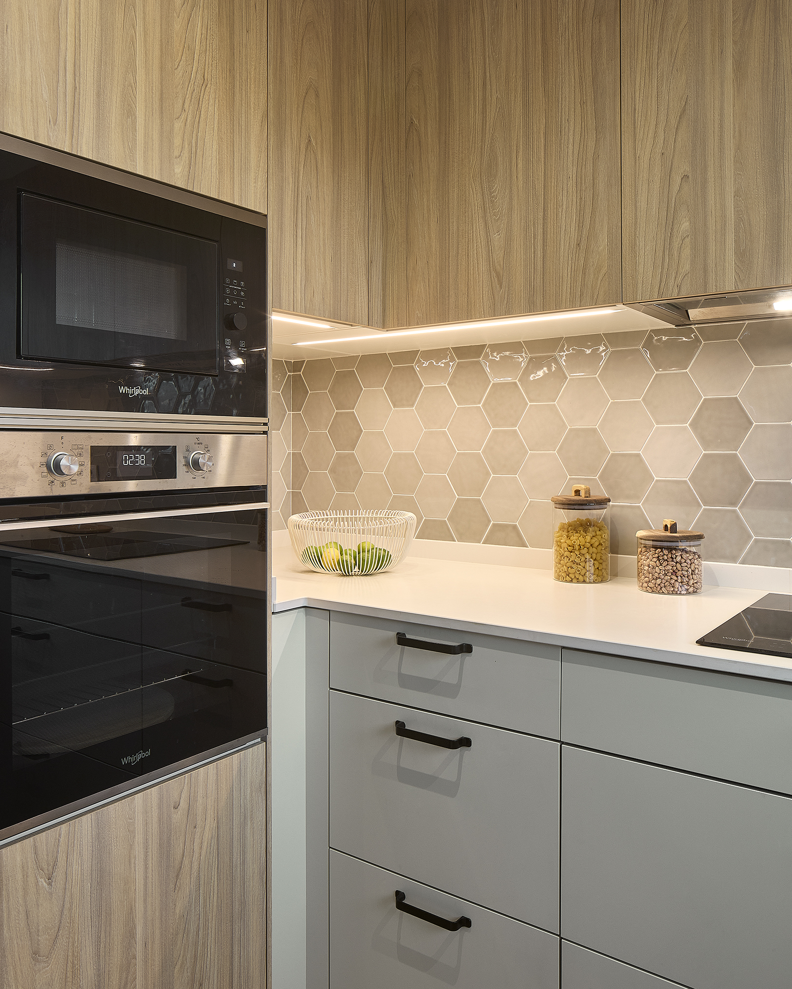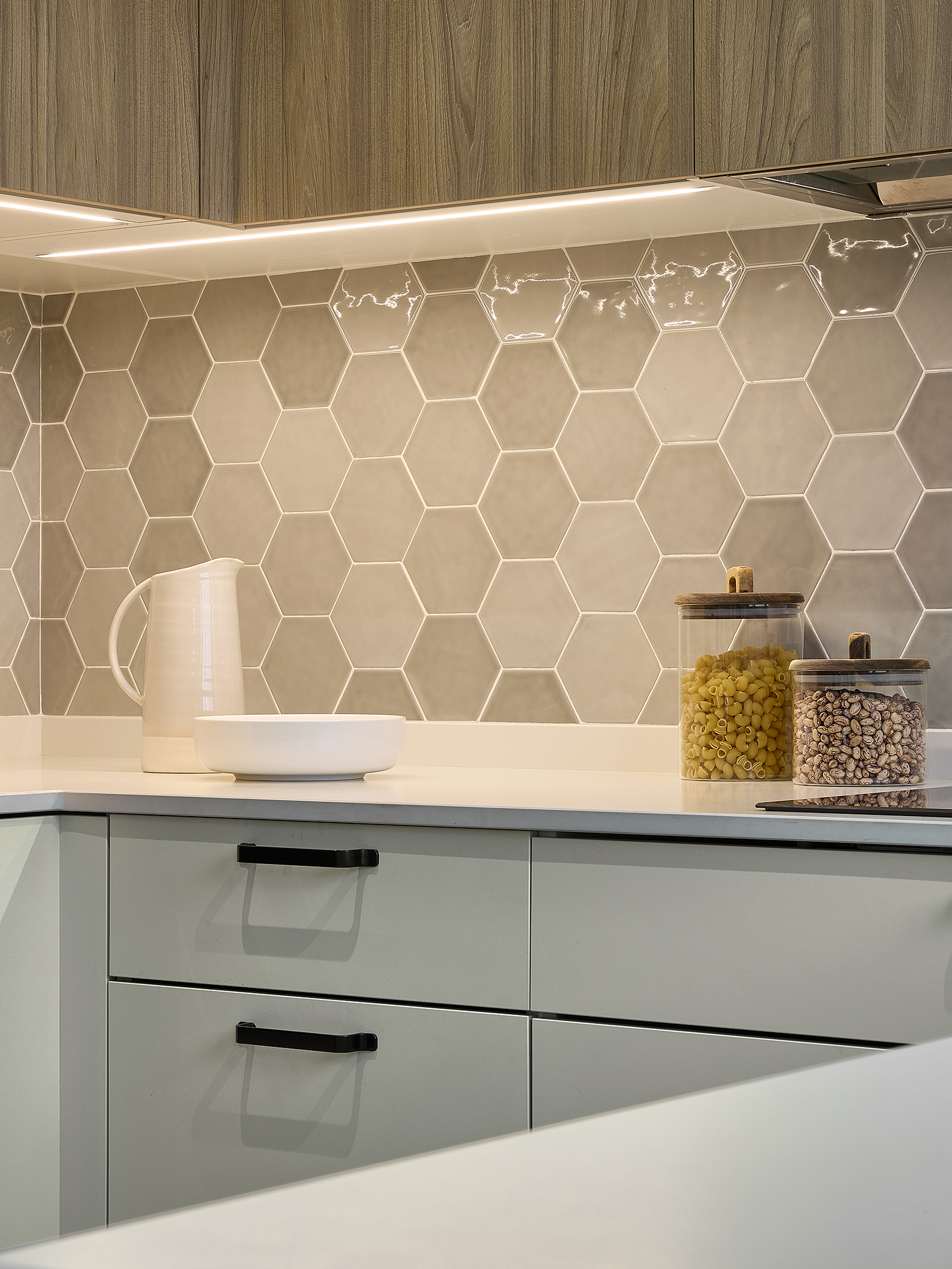 The front is covered with hexagonal tiles in gray tones chosen by the client, which bring visual dynamism and a modern touch to the kitchen as a whole.