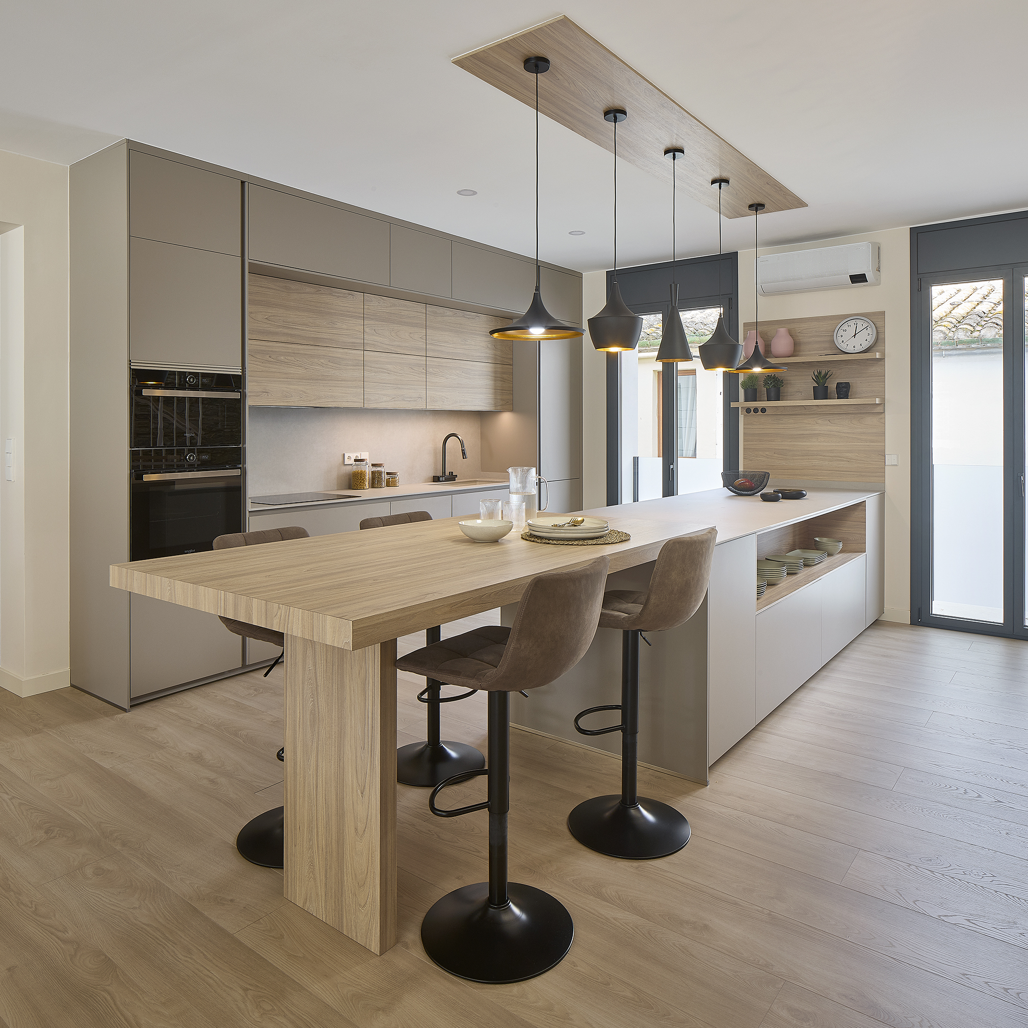L’une des grandes vertus de cette cuisine est sa péninsule avec un bar en bois attenant, qui fait office de pont entre la cuisine et le salon. Cet espace multifonctionnel vous permet de préparer votre café du matin ou de partager un apéritif tout en cuisinant. C’est le cœur social de la cuisine, idéal pour les familles modernes ou les gourmands.