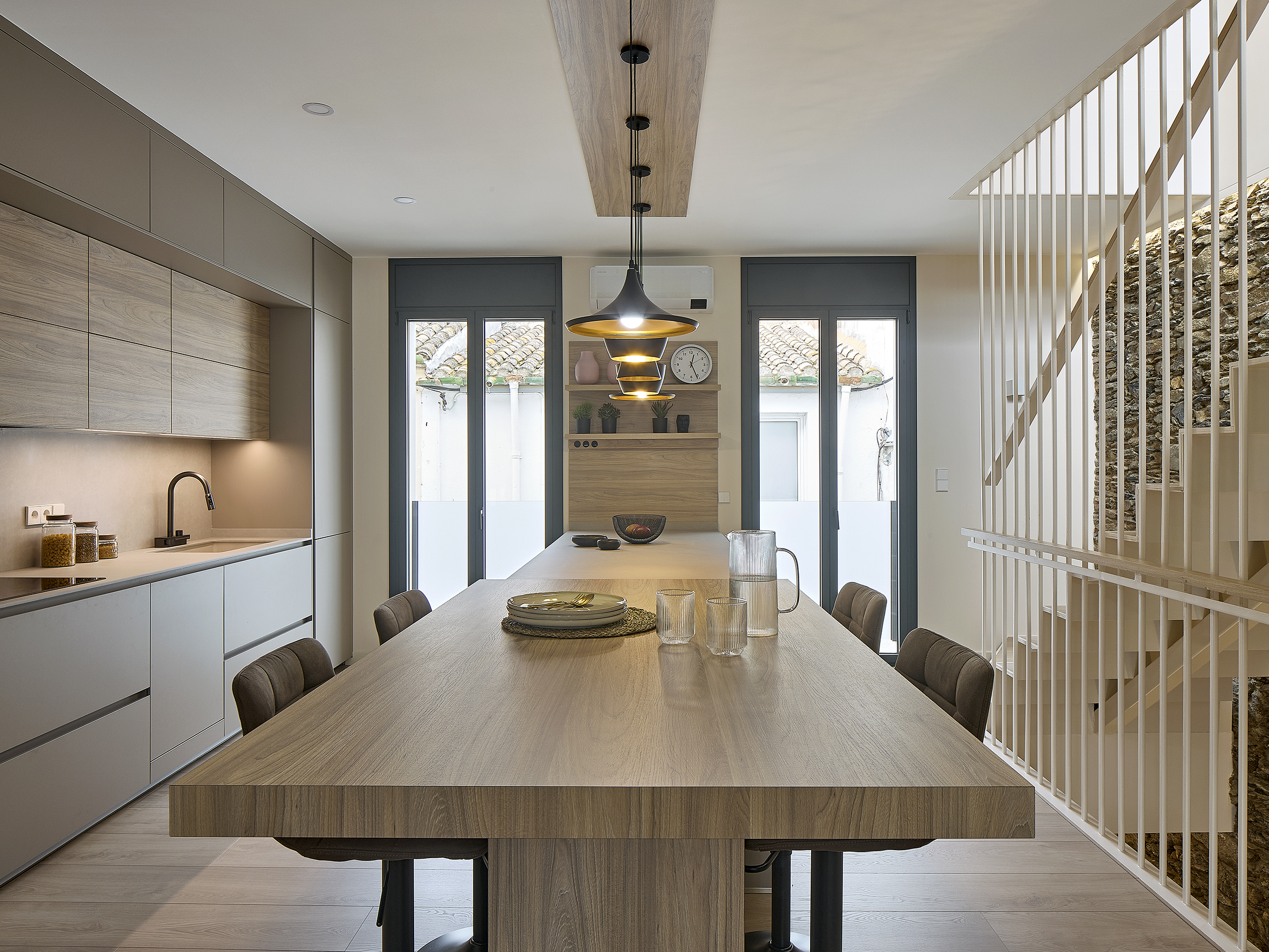 La cuisine est habillée d’un éclairage suspendu décoratif de différentes formes et textures, qui non seulement fournit une lumière focale au bar, mais agit également comme un élément esthétique distinctif. De plus, les grandes ouvertures extérieures permettent un afflux généreux de lumière naturelle, renforçant la sensation d’espace et de bien-être.