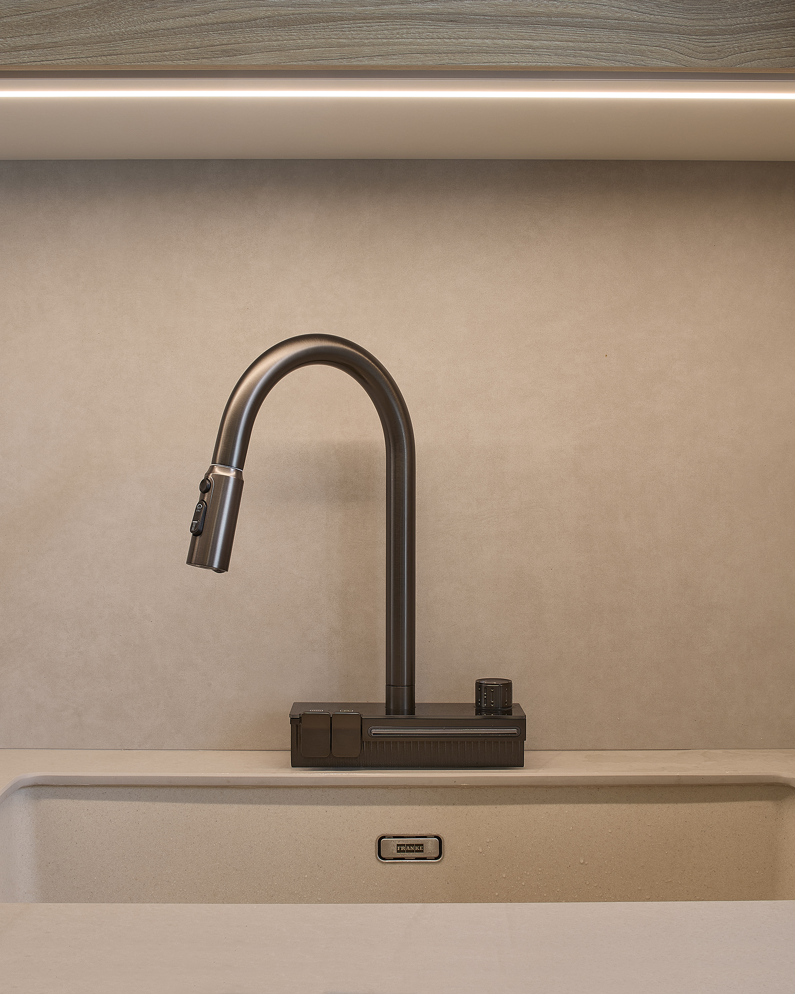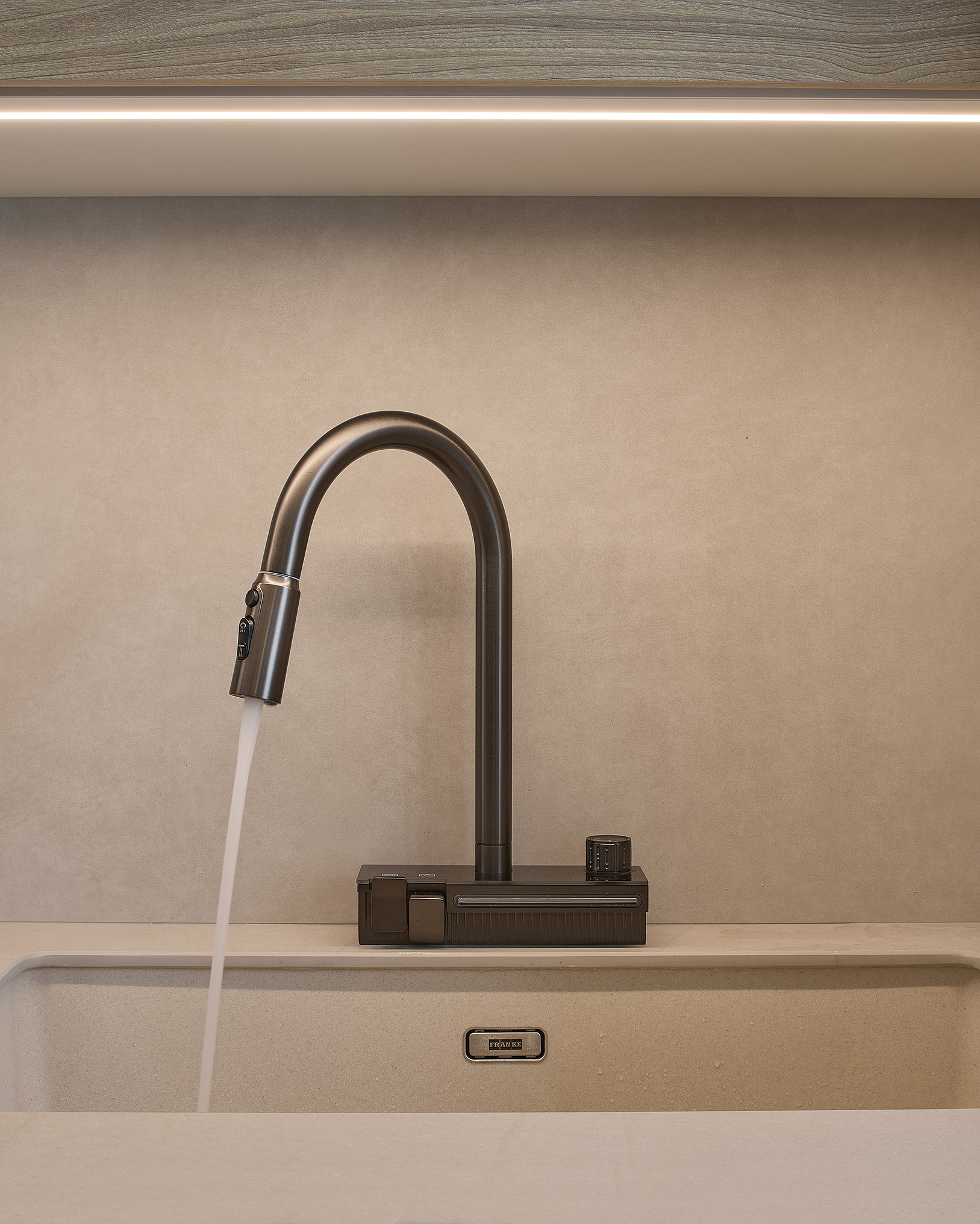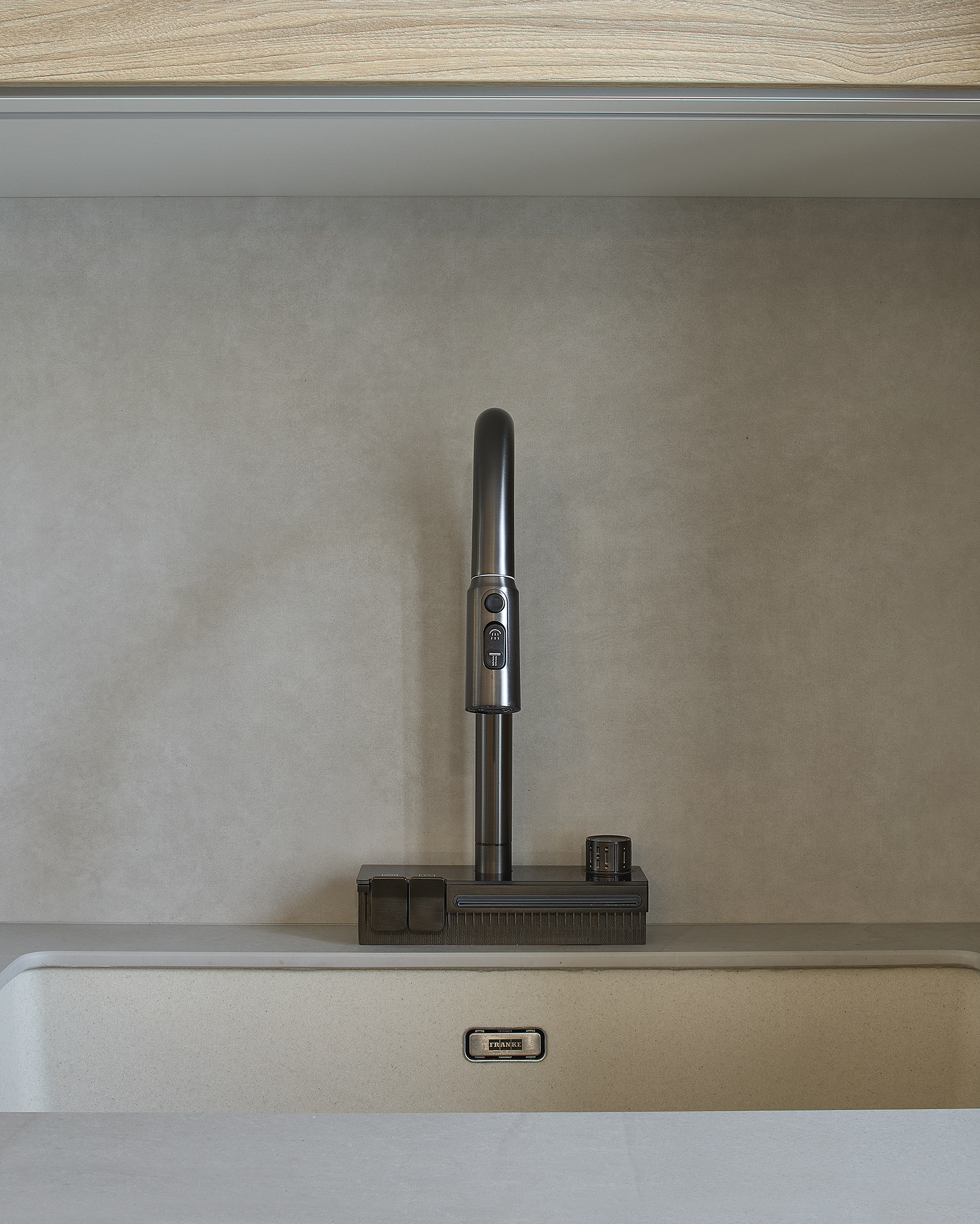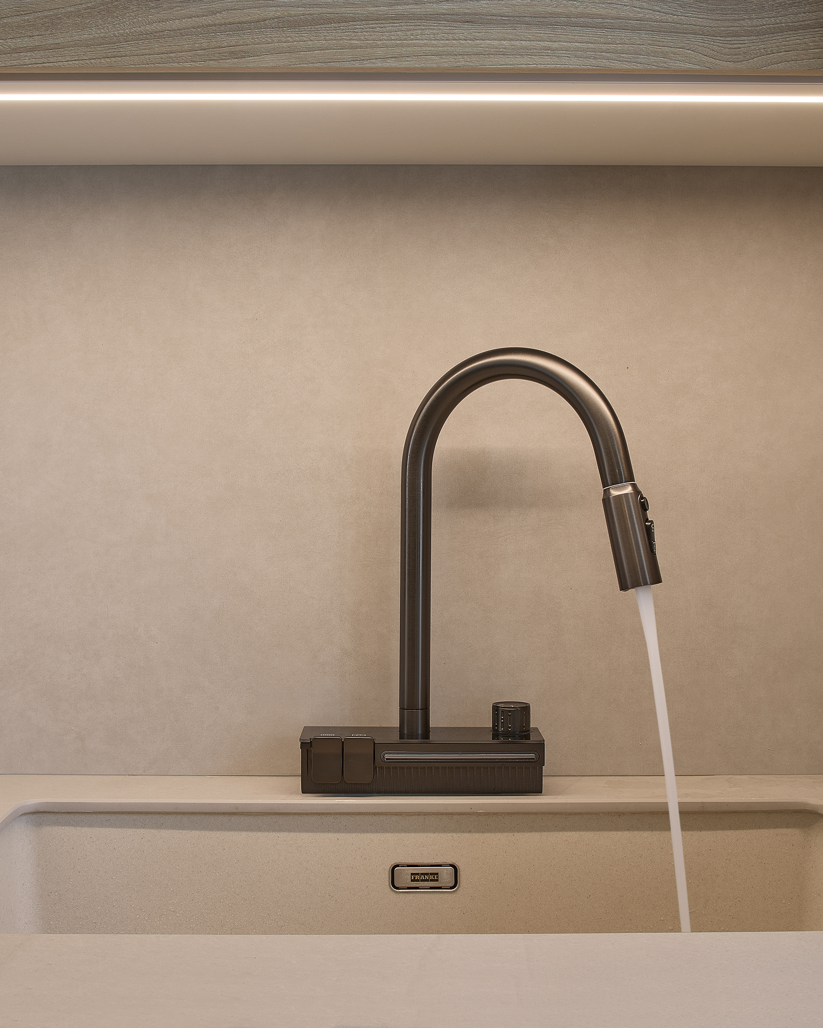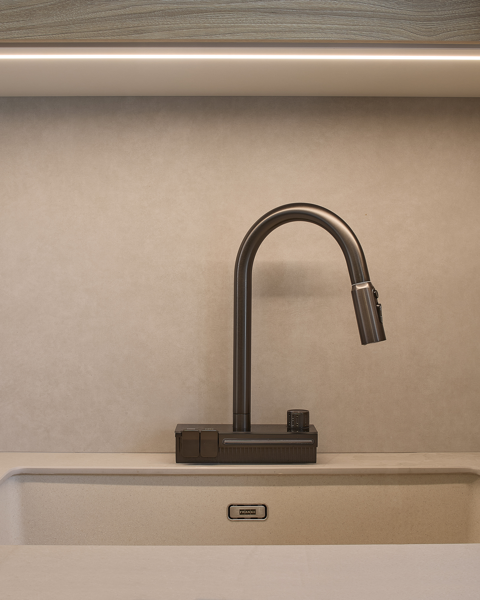 Le design minimaliste, avec des meubles aux lignes droites et des systèmes d’ouverture intégrés, renforce la sensation de propreté et d’ordre visuel. Chaque détail a été pensé pour générer une atmosphère harmonieuse, où la fonctionnalité se confond avec l’esthétique.